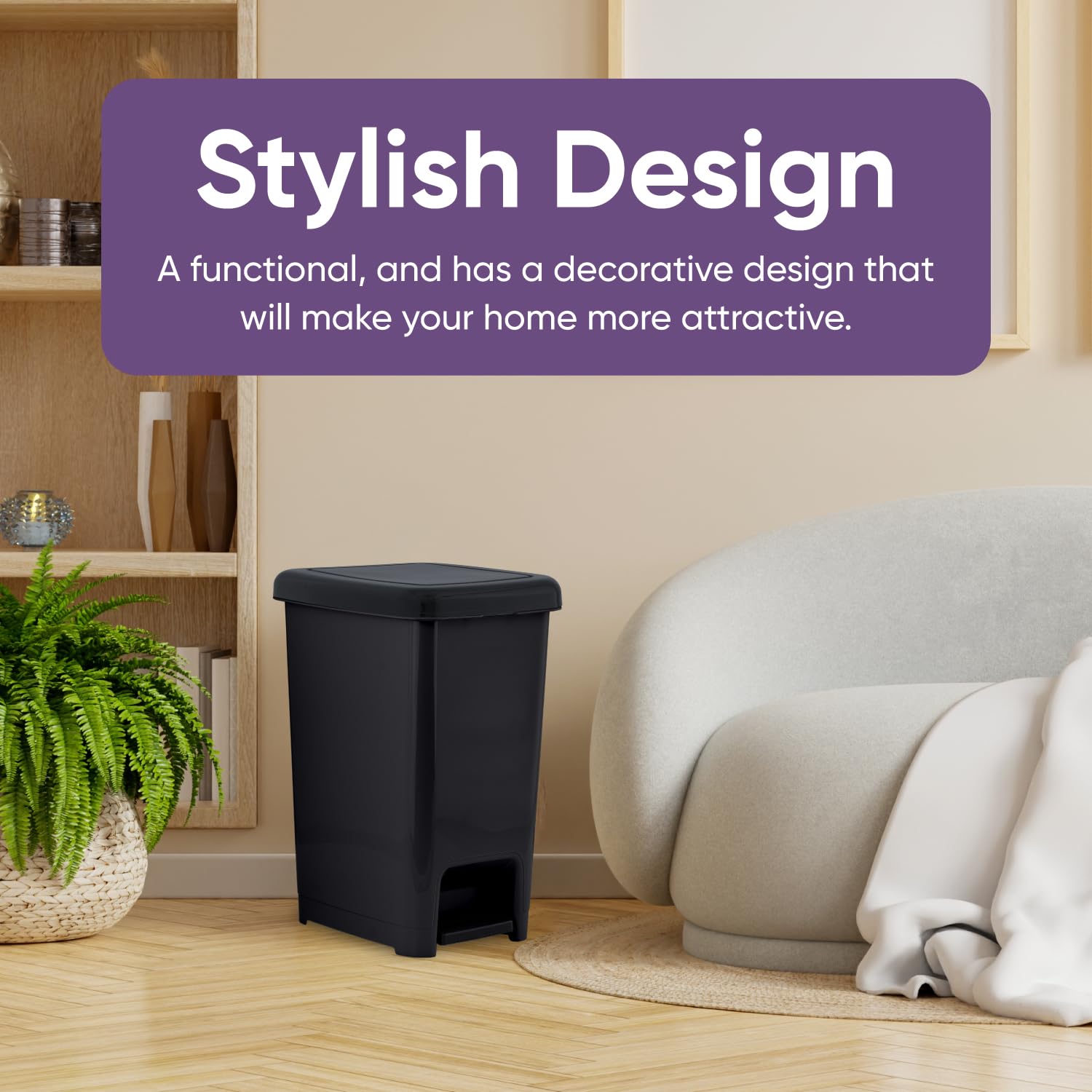 • PERFECT FOR TIGHT SPACES – Other than the practicality and functionality of this trash can, it is best to choose a step on trash can that is slim and compact with dimensions given by 11 x 8x 13.5 inches which can be a great fit for any space in your home. With its sleek and classic design, it is suitable for use as a bathroom trash can, kitchen trash can, or a small office trash can.