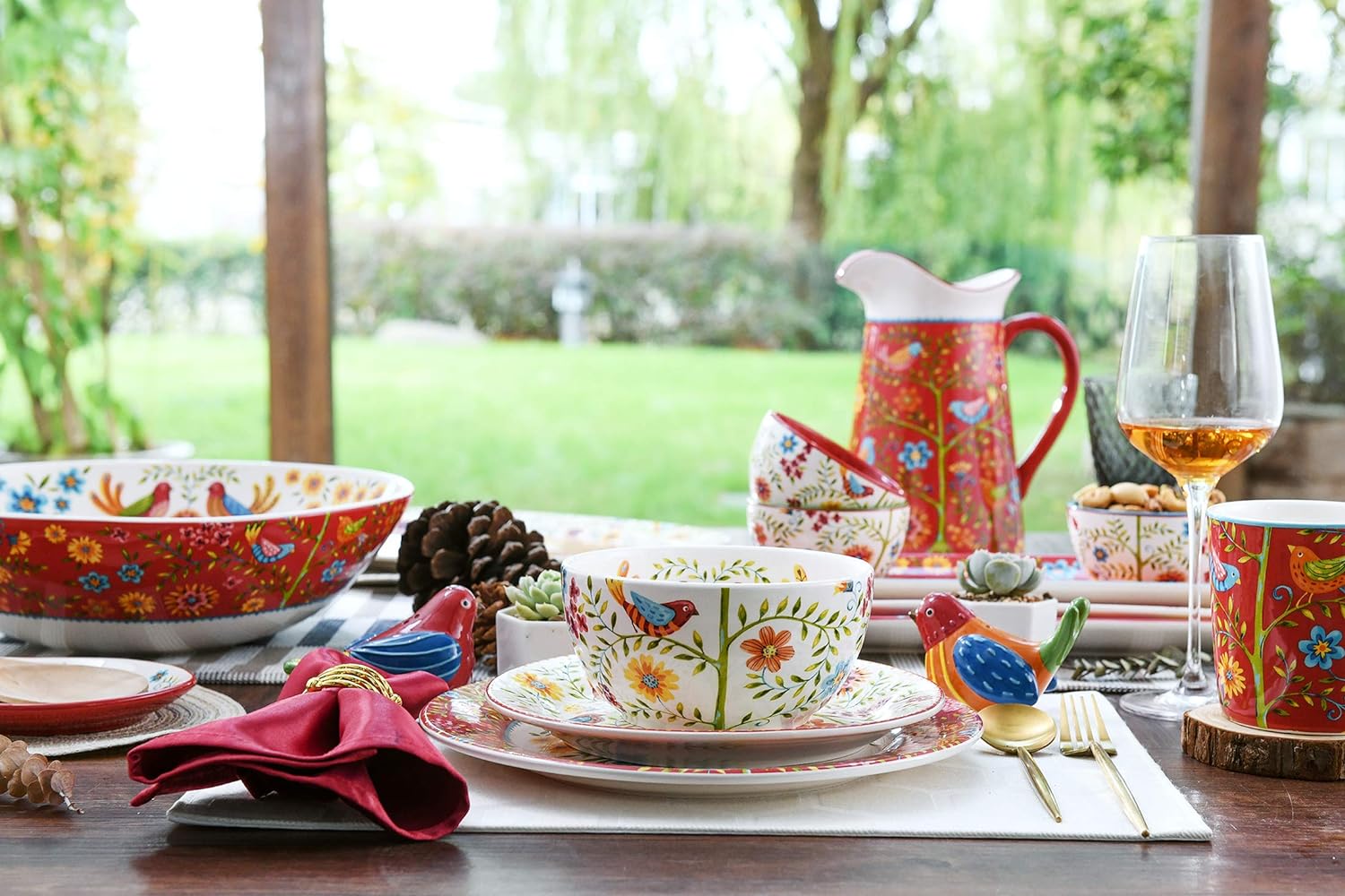 Bico Red Spring Bird Dinner Plates Set of 4, 11 Inch Large Ceramic Plates for Pasta, Steak, Stylish Serving Dishes, Microwave and Dishwasher Safe, Gift for Housewarming and Thanksgiving