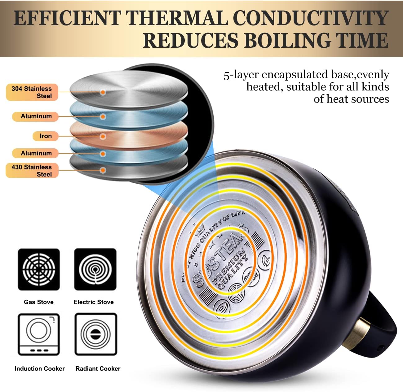 • INNOVATIVE BOTTOM BOILS WATER FASTER - SUSTEAS tea kettle is made of 5 layers encapsulated bottom, which improves heating performance while reducing heat loss, greatly shortening boiling time. It is compatible with all types of cooktops, including induction, gas, electric, halogen and radiant cooktops. You can enjoy a premium quality cup of tea or coffee at home