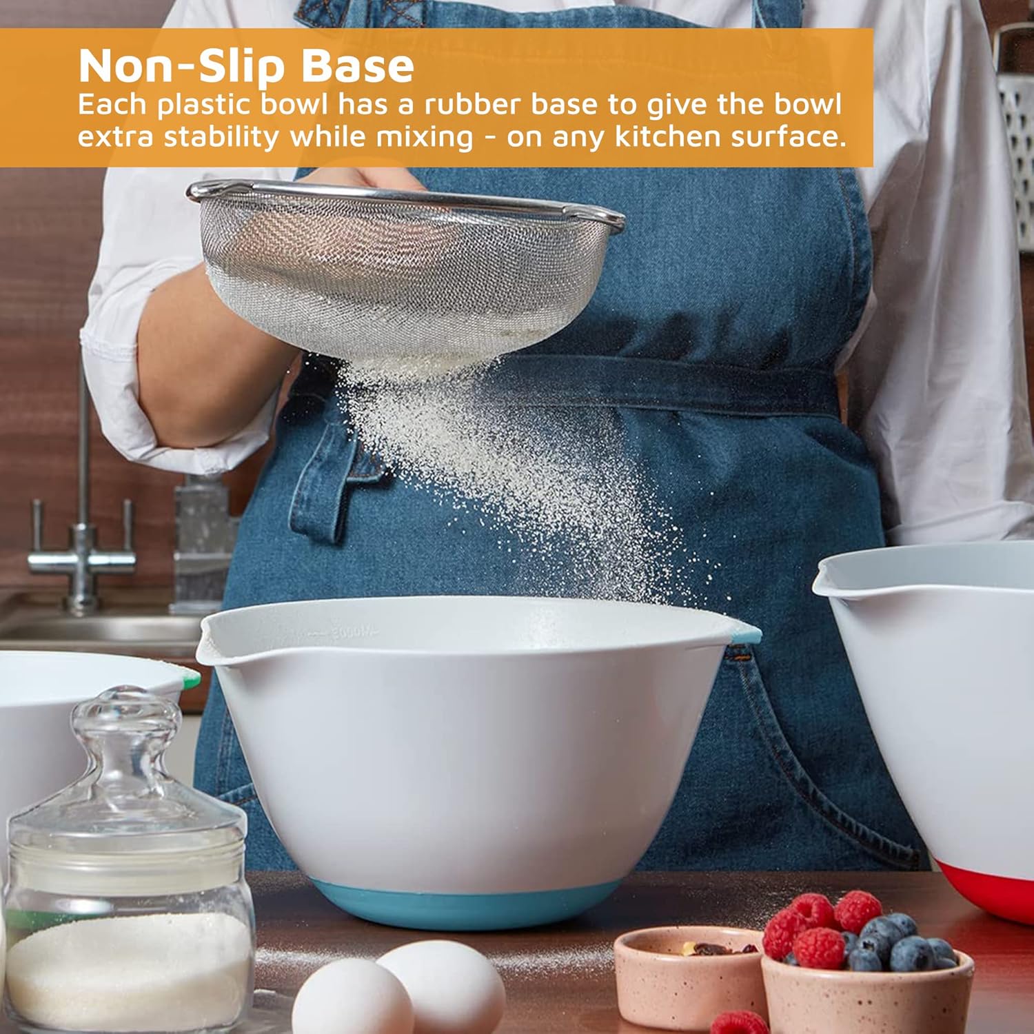 • NON-SLIP BASE - Each kitchen bowl set has a rubber base to give the bowl extra stability while mixing - on any kitchen surface.