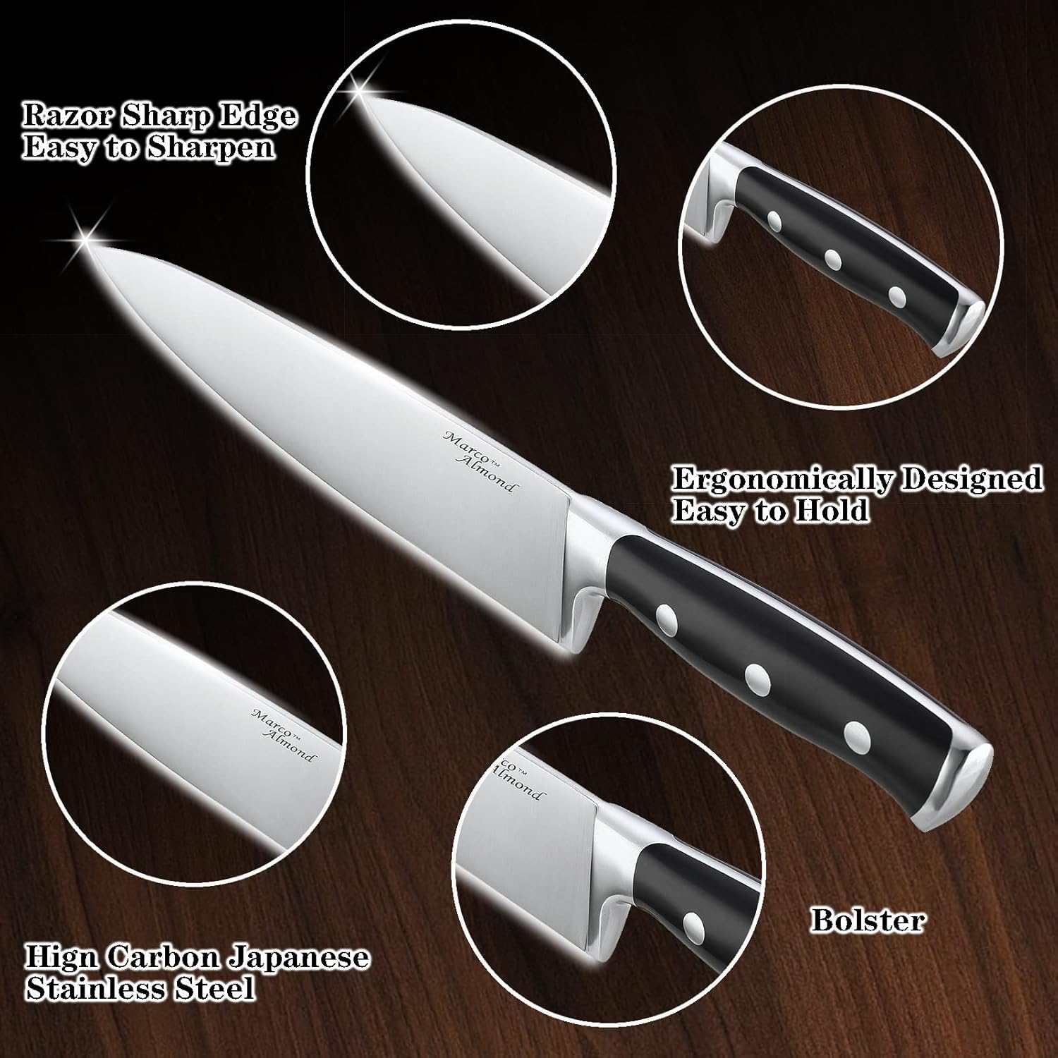 • 【Ideal Knife Set】This knife block set is a perfect and practical present for your parents, neighbors, weddings, housewarming,Thanksgiving, Christmas, birthdays, Mother’s Day, Father’s Day, New Year, Valentine's Dayor other special days. Home necessities for every family. Marco Almond kitchen knife sets based on excellent quality, after strict quality inspection, superior customer service for each customer to provide 1-ye-ar guaran-tee.