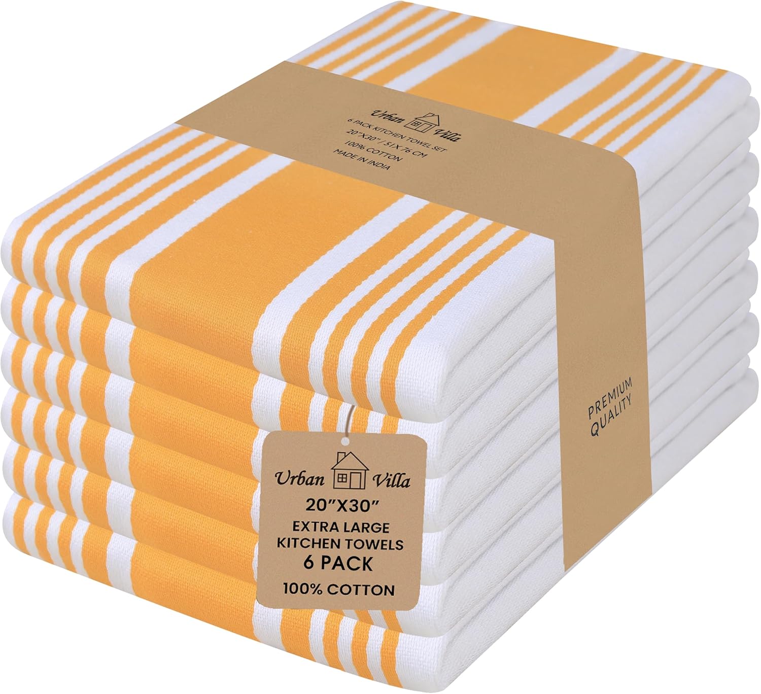 Urban Villa Kitchen Towels 100% Cotton Pack of 6, Highly Absorbent Quick Drying Super Soft Premium Dish Towels for Kitchen with Hanging Loop Hand & Tea Towels - 20x30 Inch, (Yellow & White, Striped)