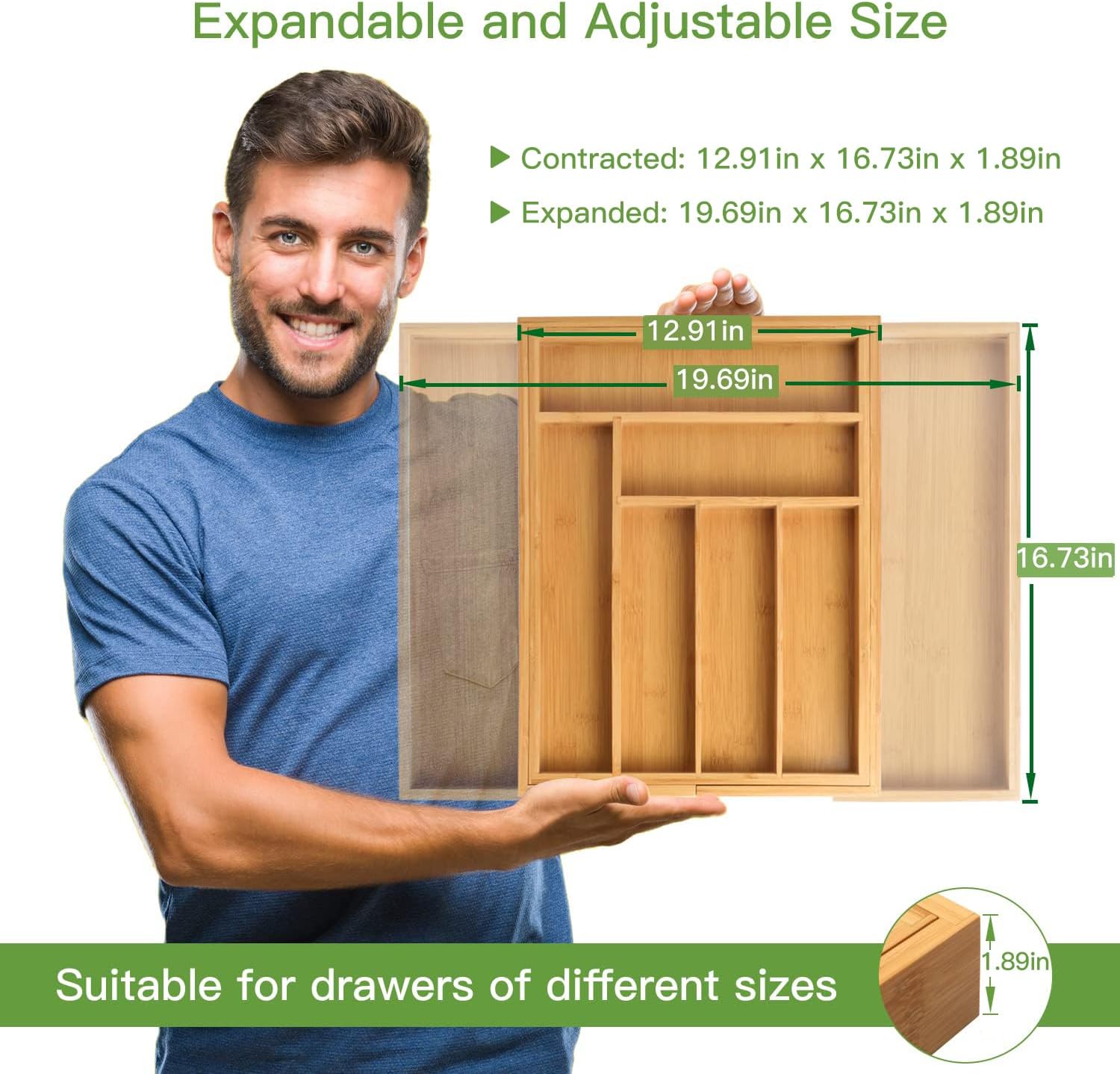 • Expandable and Adjustable Utensil Organizer: Designed with 6-8 compartments, the silverware organizer can save space while accommodating multiple items, which is expandable from 13 inches to 19.6 inches wide with smooth sliding.