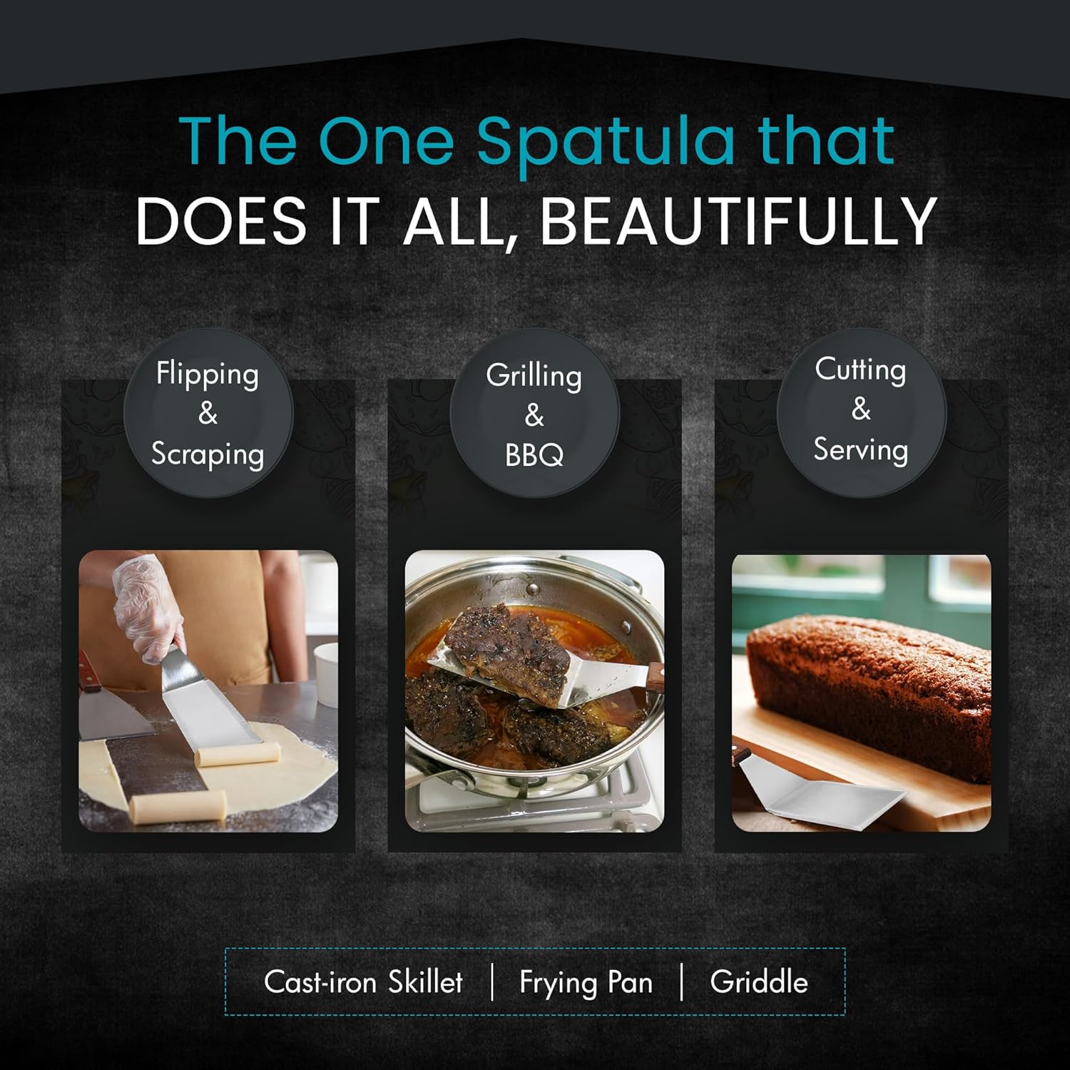 • ✅VERSATILE AND MULTIFUNCTIONAL: Our spatula turner is a versatile kitchen companion. Perfect for grilling, BBQ, and as a griddle accessory for cast iron or flat-top cooking. The beveled edges of our oversized spatula seamlessly slide for a quick and east flipping burger, cutting pizza, or serving meat and cakes. Whether you're a grilling novice or a seasoned professional, this spatula is the ideal griddle grilling accessory for backyard BBQs and more.