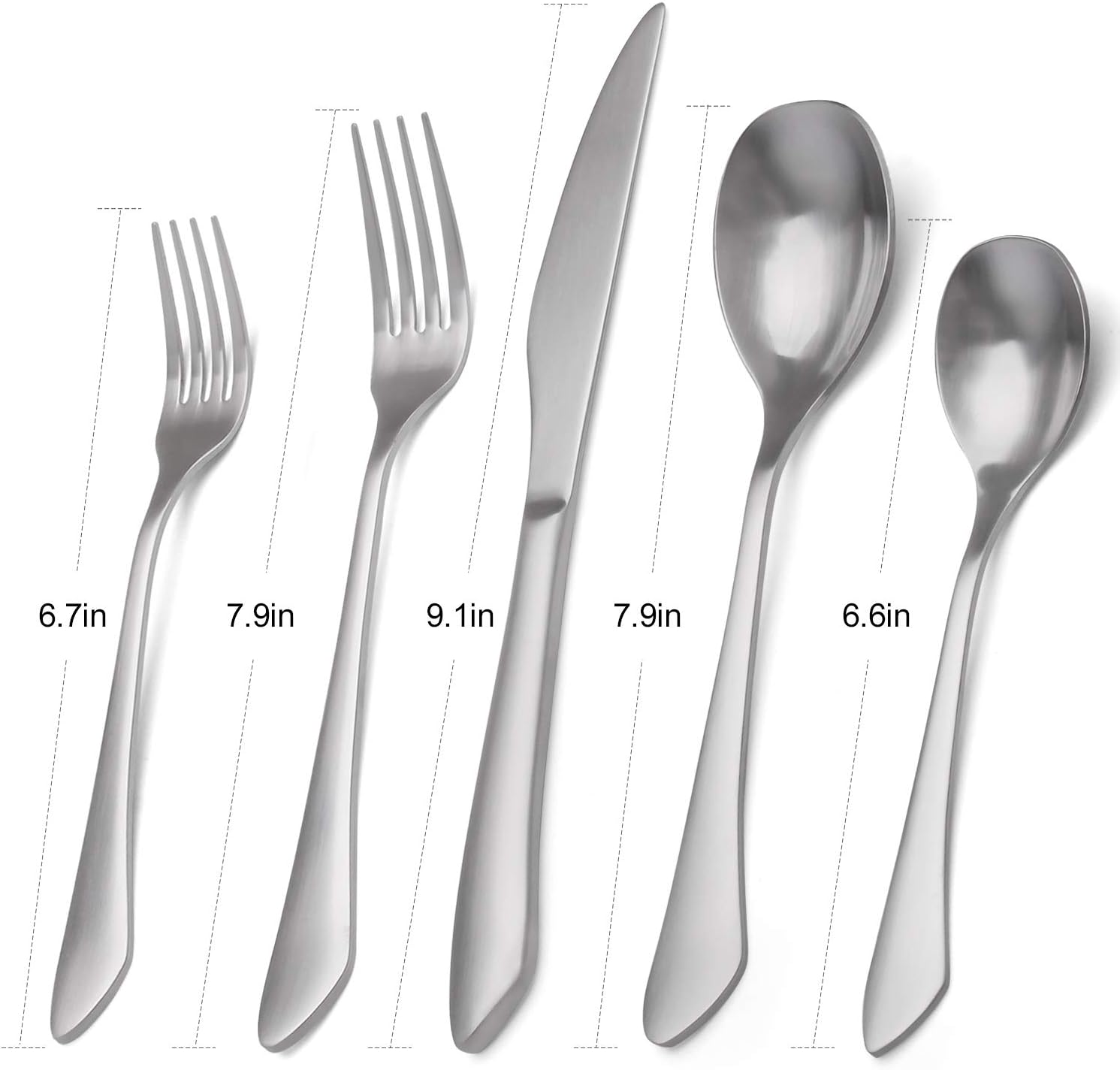 • LUXURY AND LUSTROUS DESIGN: Unique yet extraordinary, this versatile stainless flatware cutlery set features a gleaming satin polish which requires no repolishing. Elegant design and superior quality makes this silverware set suitable for kitchens,restaurants, events, and everyday meals.