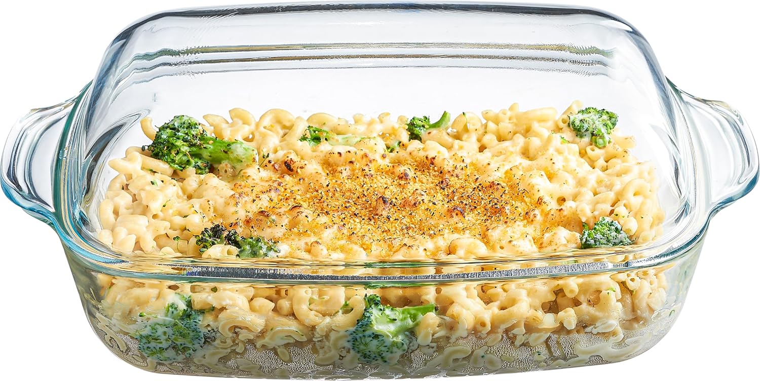 • EASY COOK AND STORE. Casserole can withstand temperatures between 572° and -40° Fahrenheit (300°/-40° Celsius). Use it to cook your food and then place the leftovers in the fridge or freezer for convenient storage – transparent glass allows you to monitor the cooking process and easily identify leftovers. Baking dish measures 14.3” x 8.1” x 5.3”. Casserole holds 3.3 quarts and lid holds another 2.4 quarts. Microwave and dishwasher safe. Cadmium and Lead free.