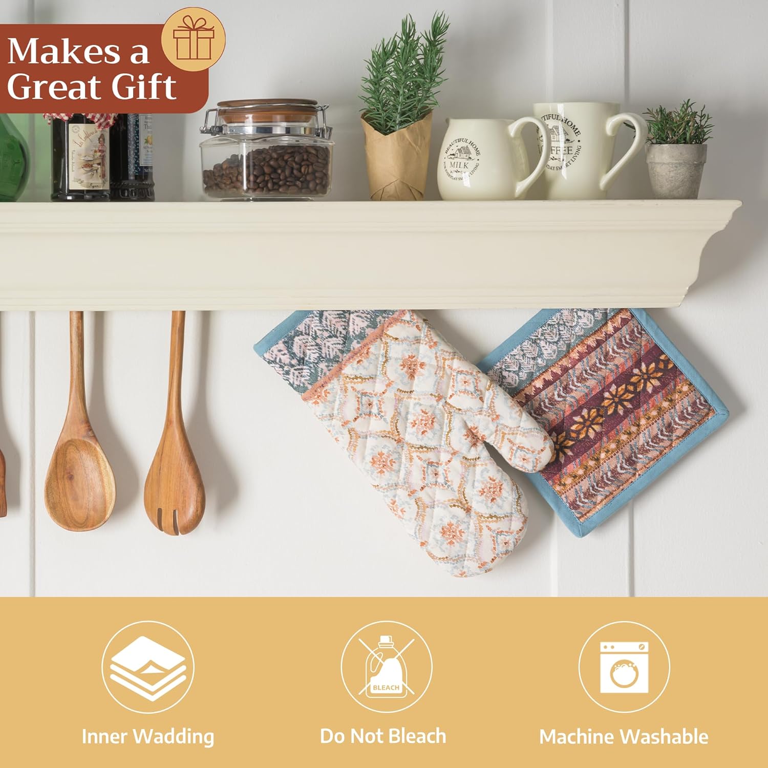 • Premium Quality: Crafted from quilted 100% cotton, this heat-resistant oven mitt and pot holder set protects your hands from hot cookware. Each piece features a built-in hanging loop for easy storage and quick access. This versatile set is perfect for everyday home kitchens, farmhouse kitchens, hotels, restaurants, and bakeries