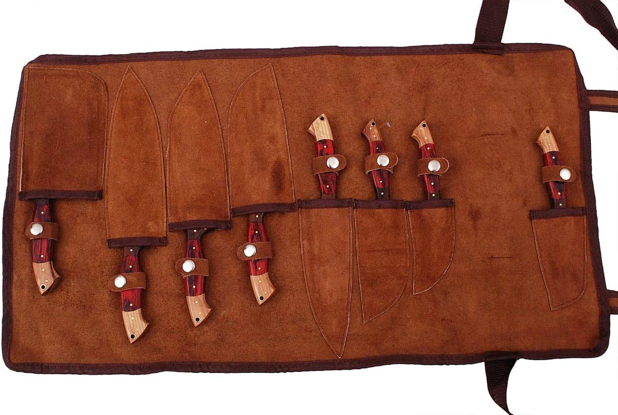 • 8 Pcs Damascus Steel Kitchen Chef Utility Knife Set with Chopper or Cleaver with 8 Pocket Roll Case Leather Bag