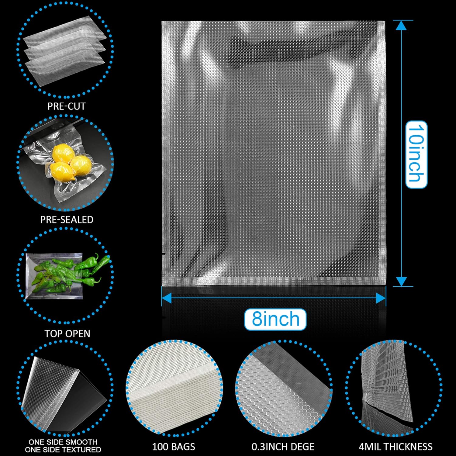 CANLENPK 8×10 Inch/20x24.5cm Vacuum Sealer Bags,Precut Easy Tear Notch Textured Food Storage Bag,Seal Meal Snack Fruit Nut,Boil Steam Heat Freeze Sous Vide Bags,Commercial Food Sealable Bags(100PCS)