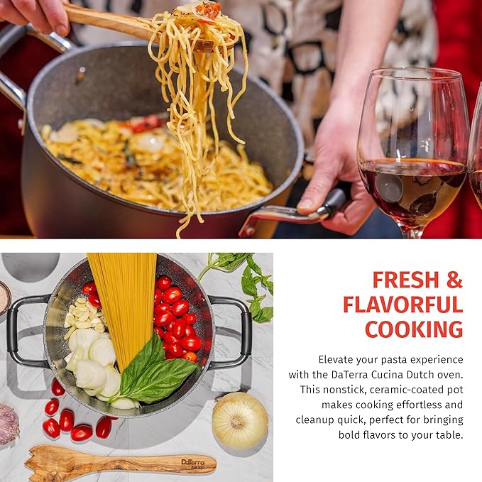 • EASY TO USE & MAINTAIN: The DaTerra Cucina Dutch Oven’s nonstick surface ensures easy cooking without sticking. Oven-safe up to 450°F, this pot makes meals simple and hassle-free. Whether you’re cooking soups, roasts, or searing, it provides excellent performance for every dish.