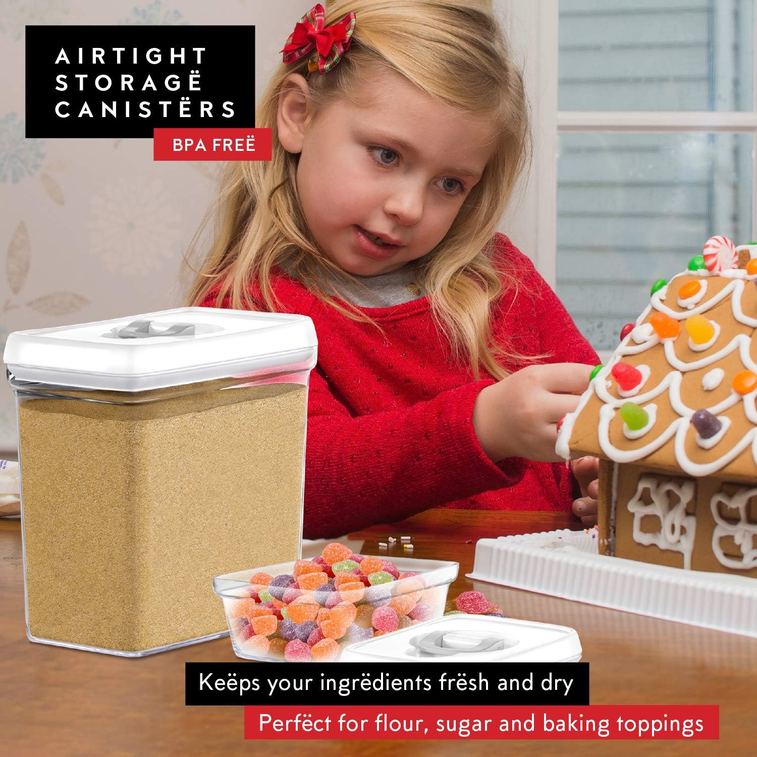 • 4 Space-Saving Storage Containers: Our kitchen flour storage containers set come in two different sizes. 2 large containers (16 cups /3.8 liters) the ideal size for a 5 lb bag of flour and sugar. 2 small containers (3.25 cups /.77 liters) that are perfect to store other baking supplies or decorating ingredients!
