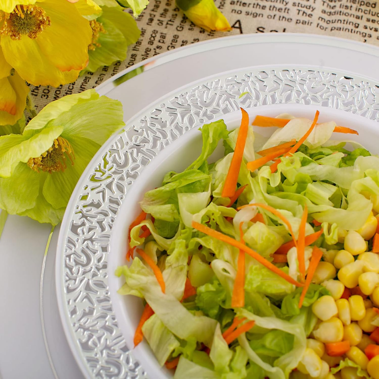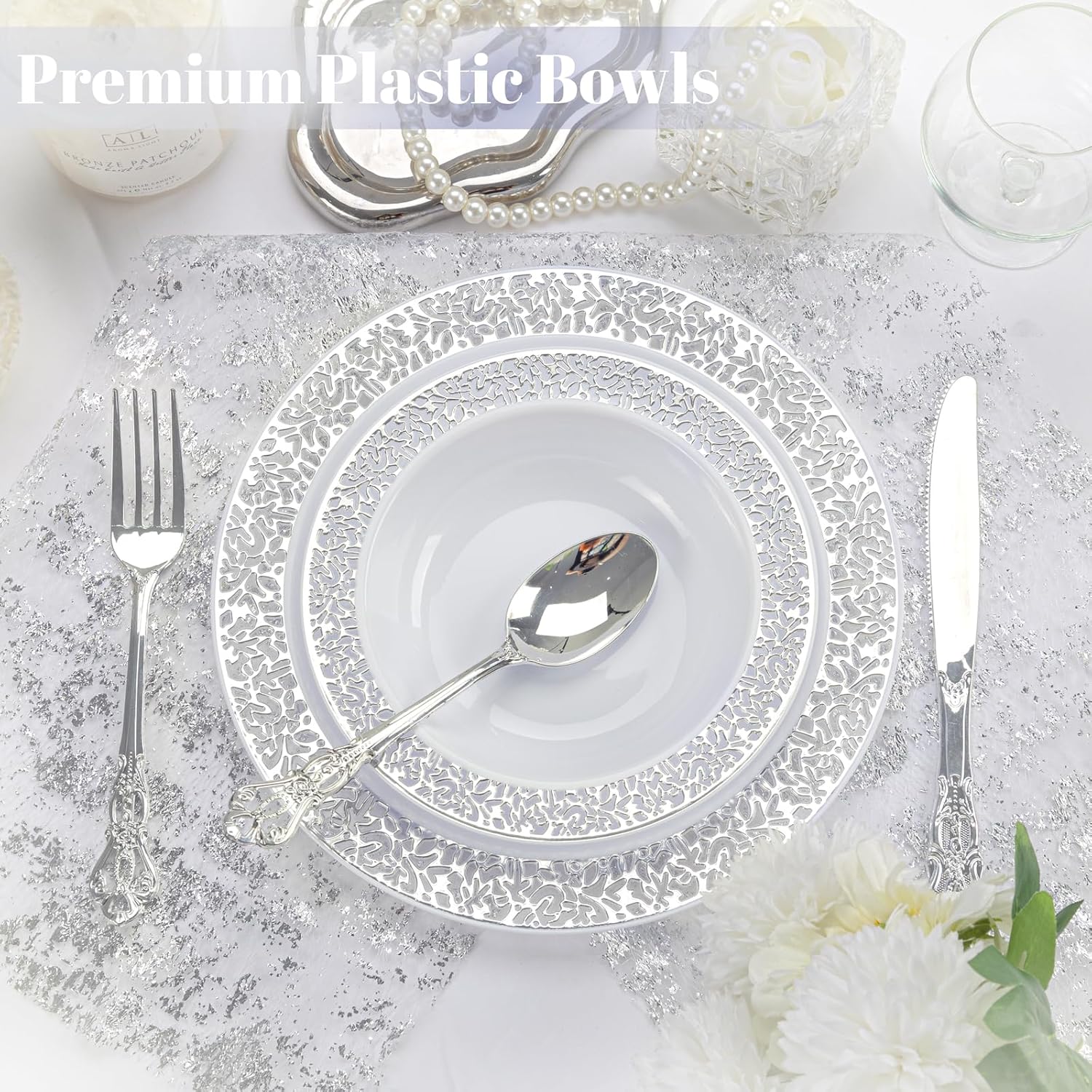 • Elegants Design. Enhanced with an attractive gold lace rim, these high-gloss white plastic silver bowls will sparkle as you wine and dine your guests, each bowl also boasts a wide rim, making it easy to handle.Ideal for Mother's Day.