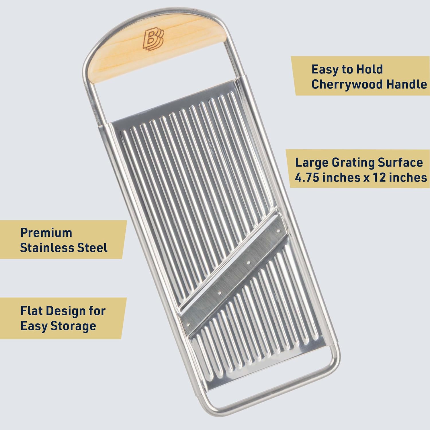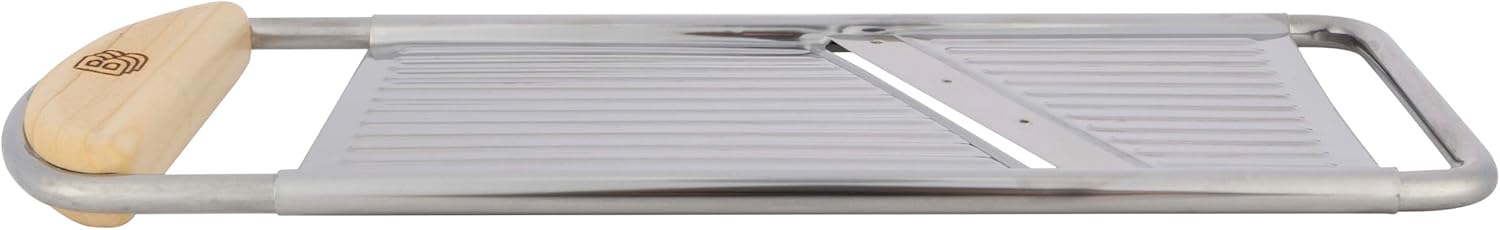 • QUALITY MATERIALS - The potato slicer is made of durable stainless steel for long-lasting use, with a beautiful cherrywood inset handle, providing you with a secure and comfortable hold. Wash our mandolin slicer by hand to preserve the wood handle.