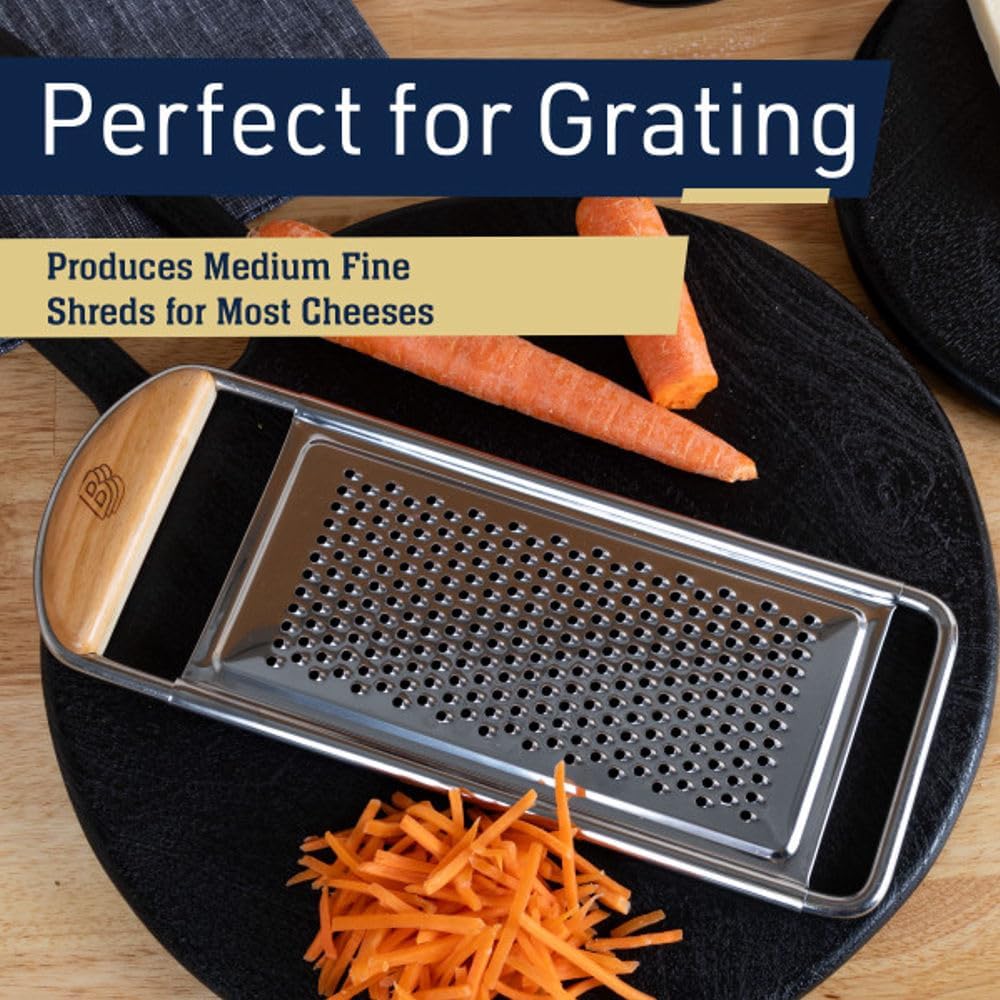 • QUALITY MATERIALS - The parmesan cheese grater is made of durable stainless steel for long-lasting use, with a beautiful cherrywood inset handle, providing you with a secure and comfortable hold. Wash our small grater by hand to preserve the wood handle.