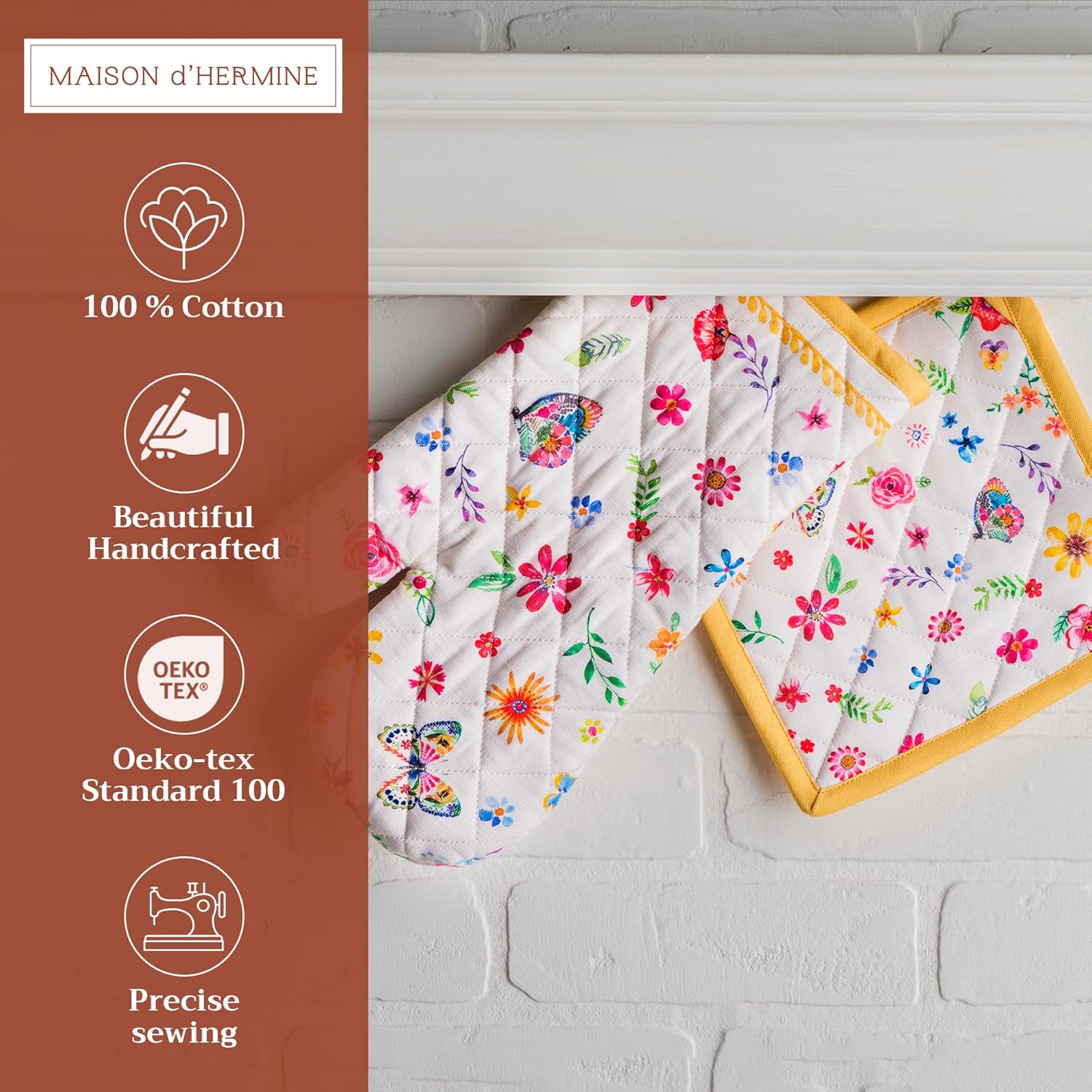 Maison d' Hermine 100% Cotton Oven Mitt & Pot Holder Set (7.5"x13" & 8"x8") Heat Resistant BBQ Cooking Gloves with Loop, Grilling, Kitchen, Handling Hot Pans Spring/Summer (Happy Florals - Sweety)