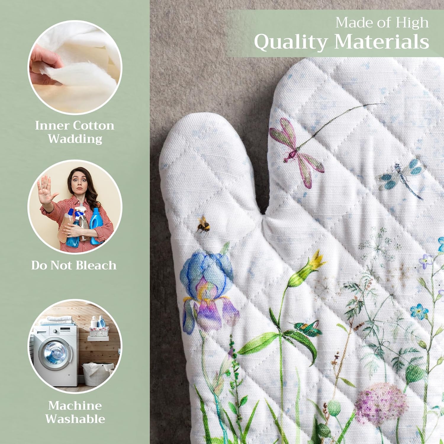 Maison d' Hermine Oven Gloves 100% Cotton Oven Mitt 7" x 13" with Loop Heat Resistant, BBQ, Cooking Gloves, Baking, Grilling, Kitchen, Handling Hot Pans Spring/Summer (Pack of 1, Fleurs De Mai)