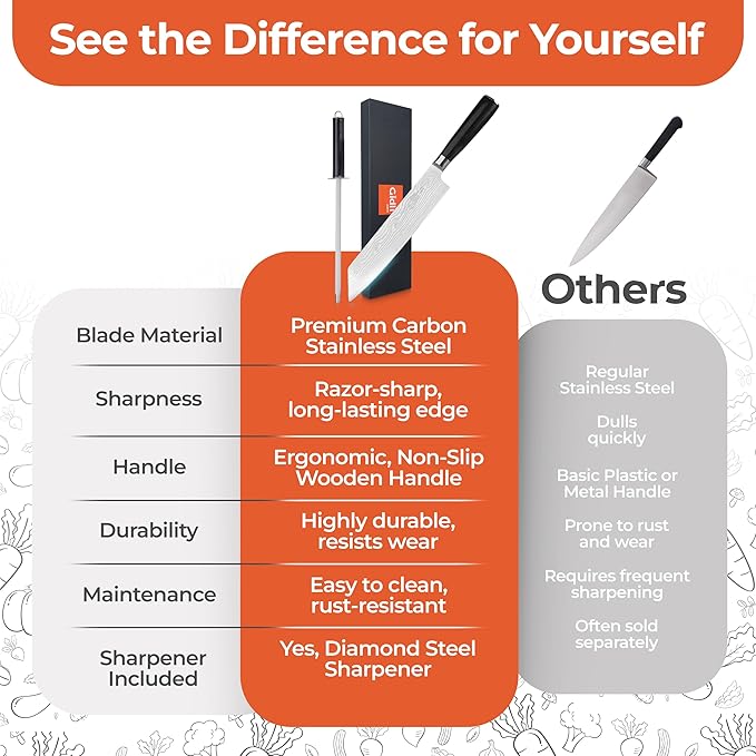 • Ultra-Sharp & Long-Lasting – Expertly honed for precision, the razor-sharp edge delivers clean cuts every time. The included diamond steel sharpener keeps your chefs knife in peak condition, making meal prep seamless and efficient.