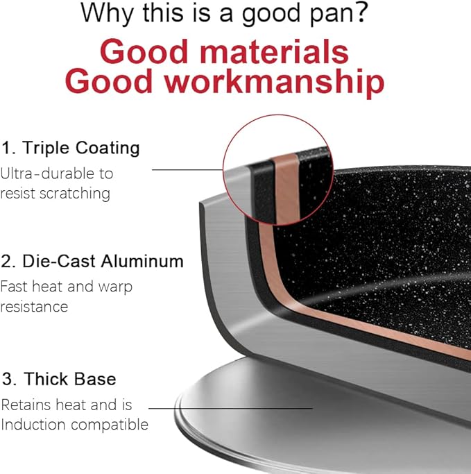 • 【What makes a good nonstick pan】- Nonstick performance is the key. Only the three-layer nonstick coating can achieve true long-lasting nonstick, Caannasweis nonstick pans are designed for people who cook at high frequencies and can pass 10,000 times wear test.