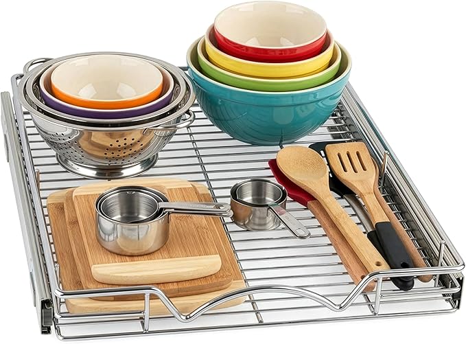 • HIGH QUALITY: Made of durable metal with chrome finish the pull out shelf for kitchen cabinet is simple and easy to install. Designed to fit any style of cabinetry and easy to clean.