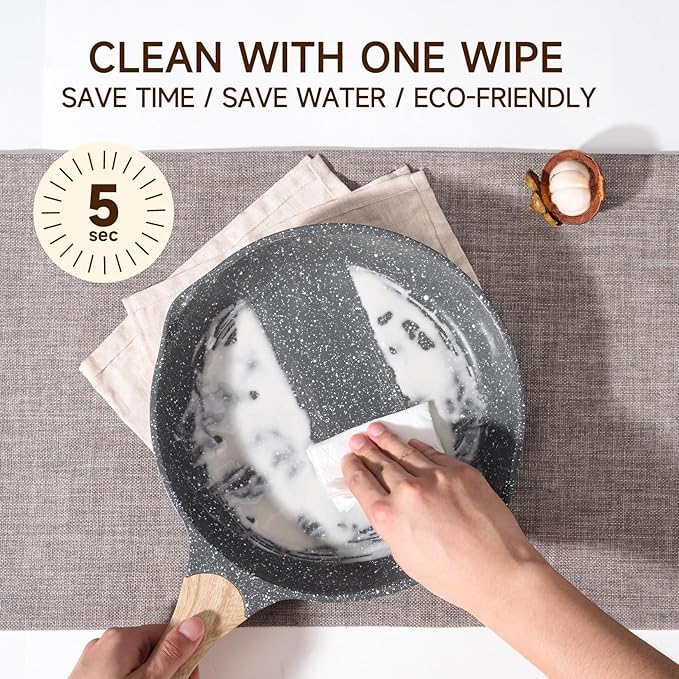 • 【Super Easy To Clean】Our non-stick frying pan cleans up in seconds, the eco-friendly coating makes cleaning a breeze, wipe it with a paper towel or rinse it with a little water. Hand washing is recommended to maintain coating longevity