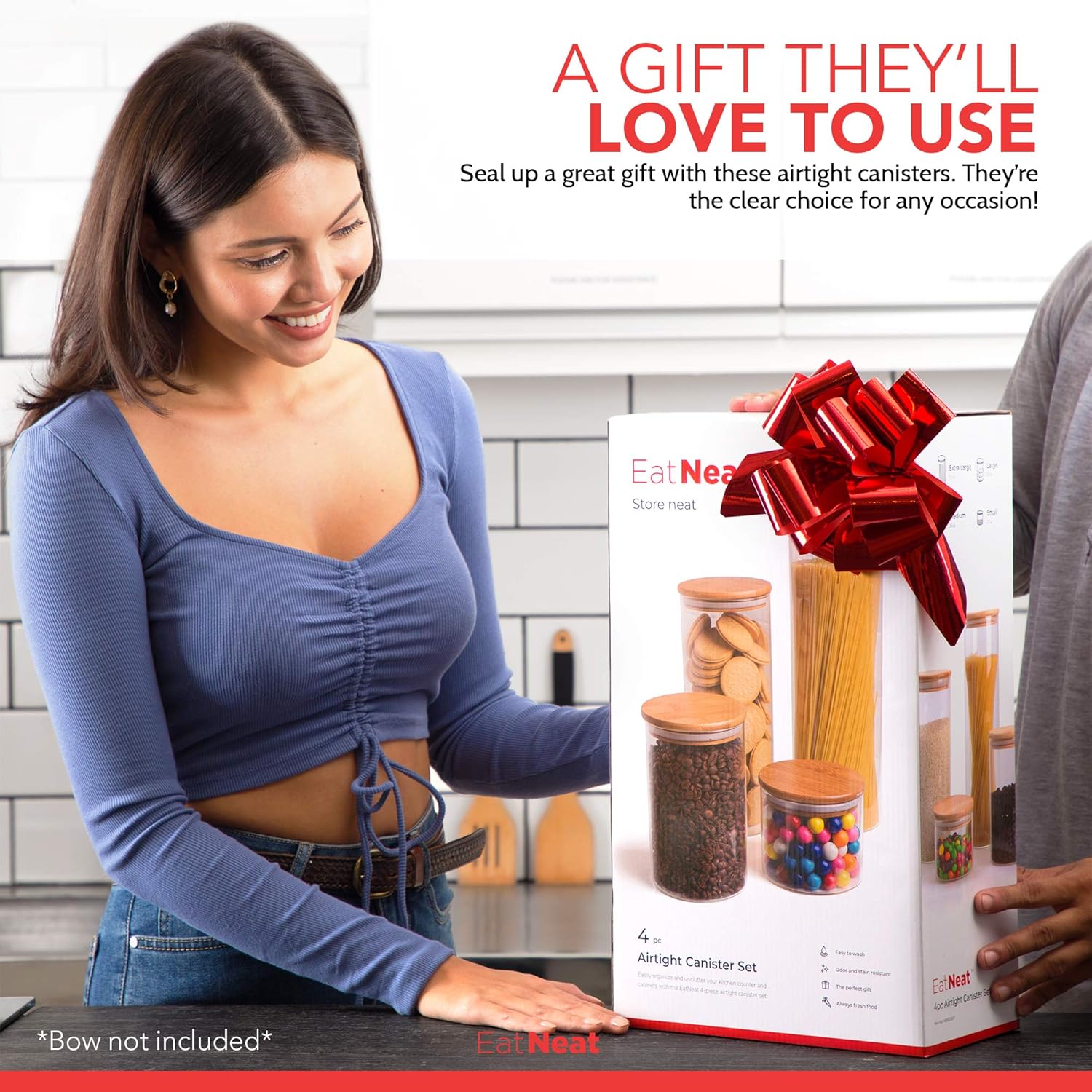 EatNeat 4‑Piece Glass Canister Set with Airtight Bamboo Lids – Giftable Kitchen Storage – Tall Jar Fits Spaghetti – 74/56/36/20 oz for Pantry, Dry Goods, Coffee, Snacks & More