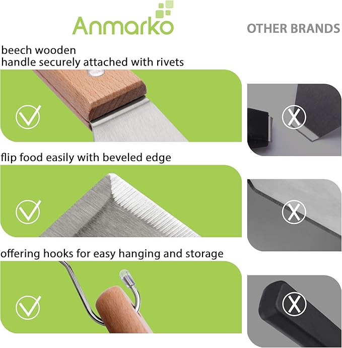 • ✅ FIRM GRIP - ergonomic and comfortable foodsafe beech wooden handle with hole and 2 hooks for easy hanging. Handle securely riveted with a rivets. Flat spatula and stainless steel turner are very well balanced . Metal spatula set is handwash only. Whipe spatulas dry after washing.