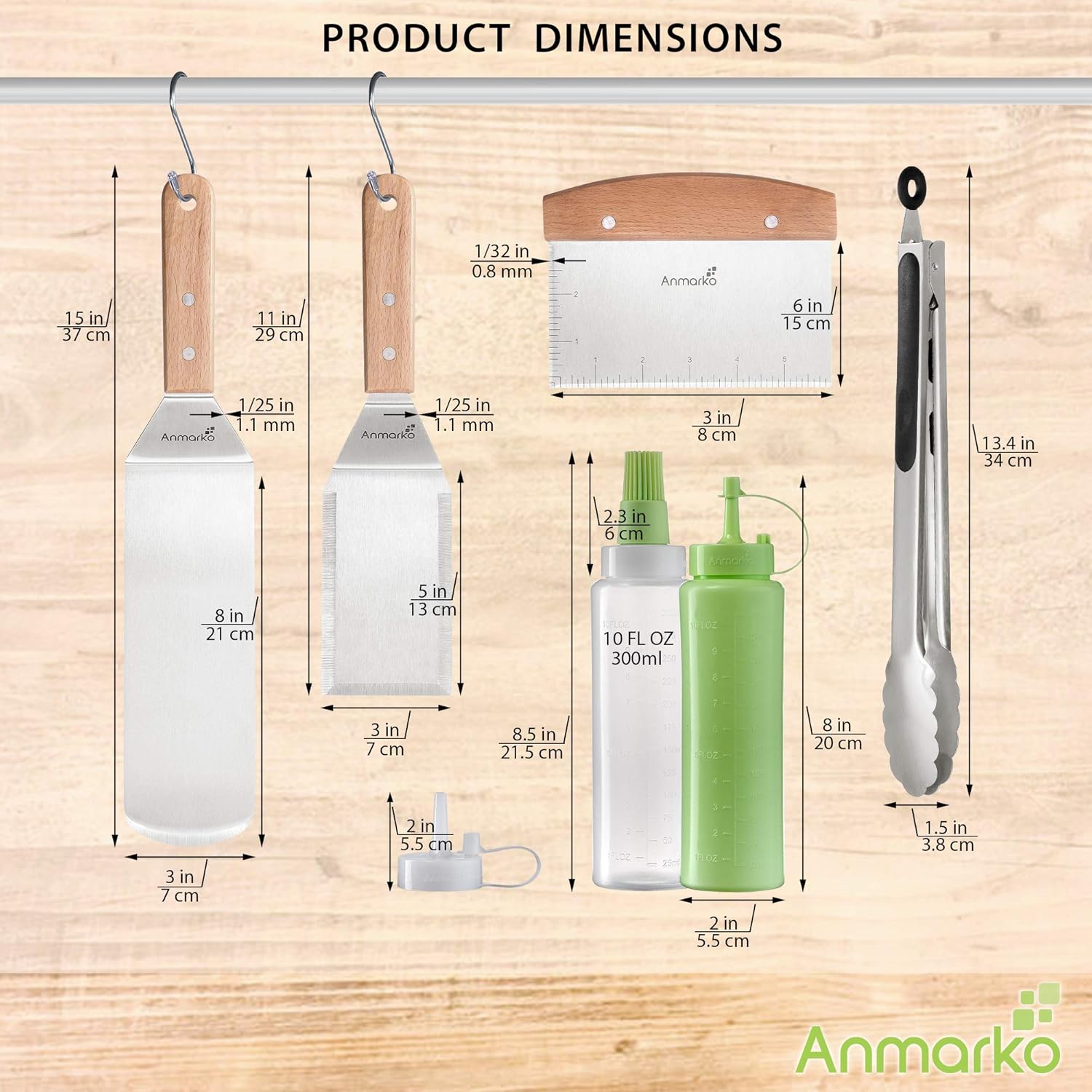 • Professional Stainless steel spatula set - includes 1 x cooking spatula turner, 1 x grill spatula, 1 x hamburger turner 4 x 8 inch, 1 x griddle scraper, 1 x grill tongs, 2 x squeeze bottles with silicone brush lid.