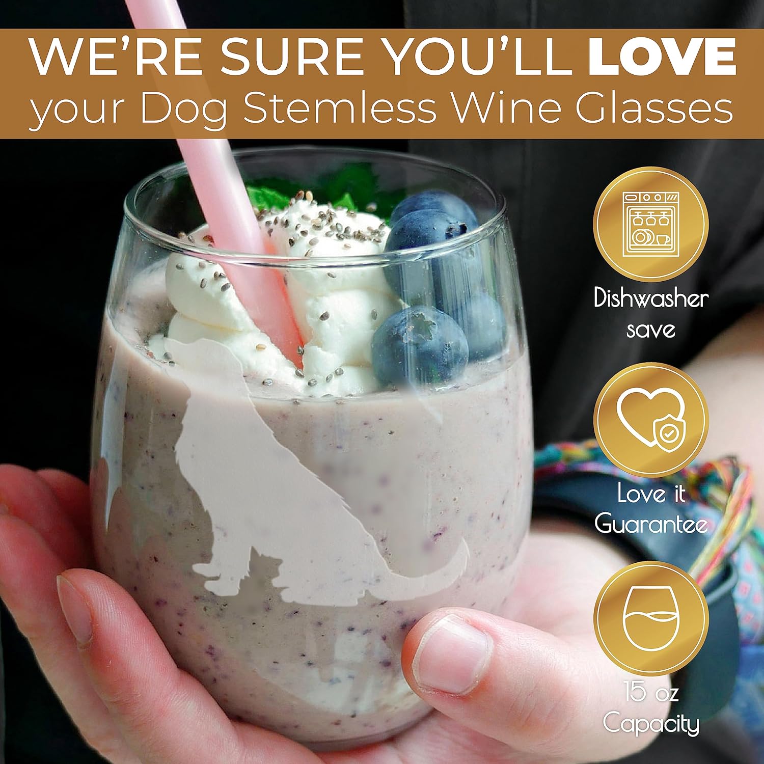 • Celebrate your favorite dog breed - Proud Golden Retriever parents, these glasses are for you! Each stemless glass has 2 etched silhouettes of an adult Golden Retriever on the outside, and the special breed name etched into the bottom. Comes in a set of 2 for sharing!