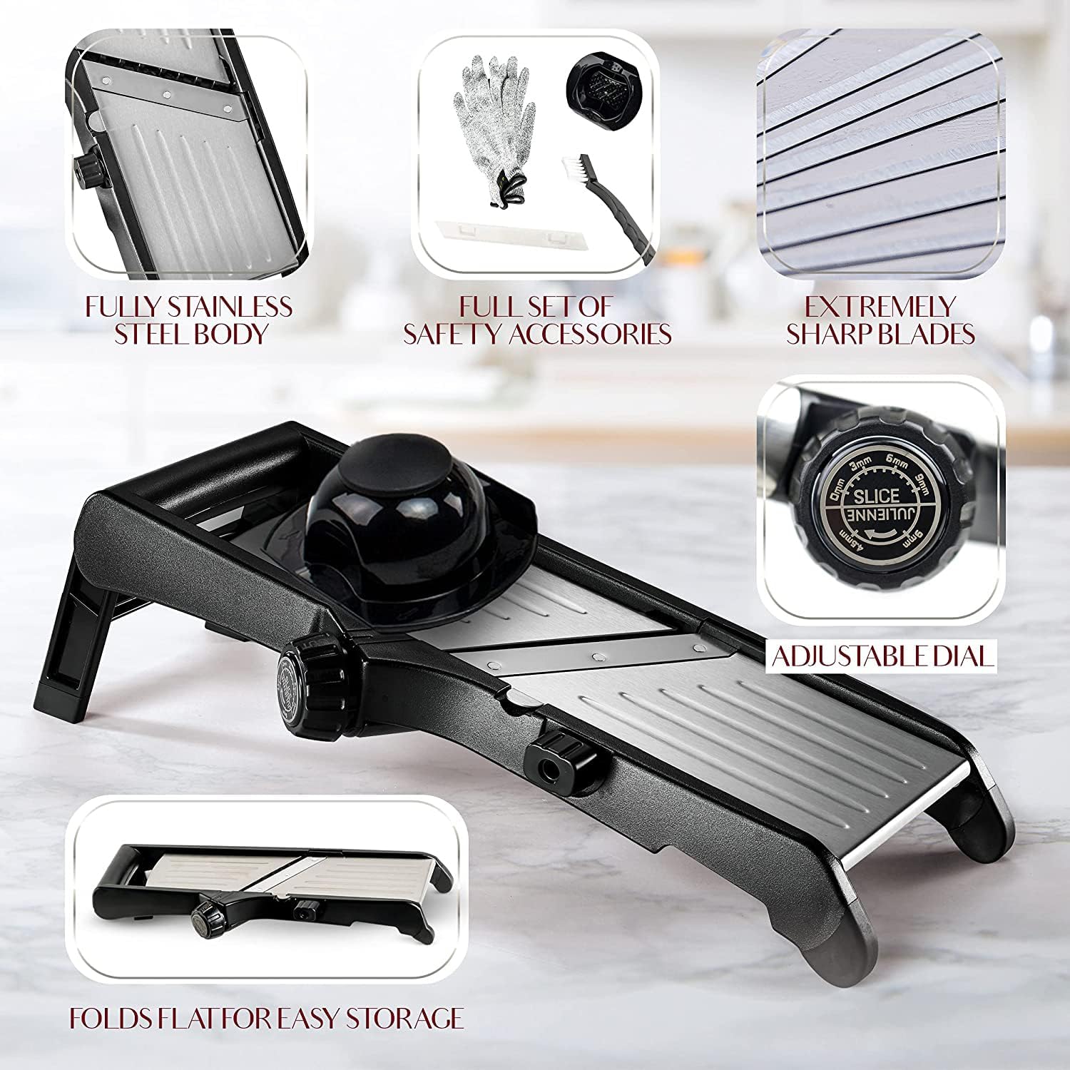 • WHILE OTHER MANDOLINE SLICERS CAN BE DANGEROUS AND EVEN SLICE YOUR FINGERS, ours is the ONLY mandoline that comes with what you need for safely slicing veggies. No need to touch the blades - EVER. Ours is the only slicer that comes with what YOU NEED FOR SAFELY SLICING your veggies. Cut-resistant SAFETY GLOVES. A BLADE GUARD for storage. A FOOD HOLDER for slicing. A specially-designed BRUSH for cleaning. NO WORRIES about your fingers - cut veggies safely and easily.