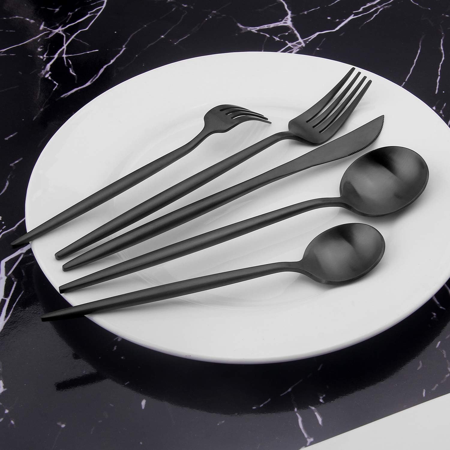 • ★ Modern silverware set--This eating utensils sets have the slim profiles and pointed stems, is a sophisticated take on minimalist design. The black kitchen utensils set includes everything you need for a formal full-course meal. They can match your modern dinnerware set and dish set perfectly.