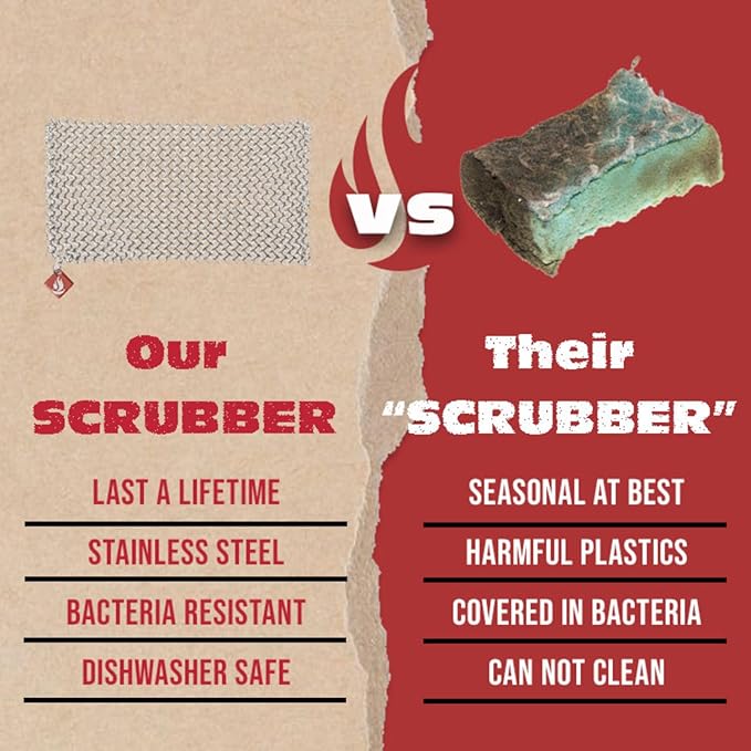 • DELIVERING A LIFETIME OF QUALITY AND RESULTS. Our cast iron cleaner chainmail scrubber is Engineered for precision Backed for a lifetime Industry leader for cast iron, stainless steel, hard anodized cookware.
