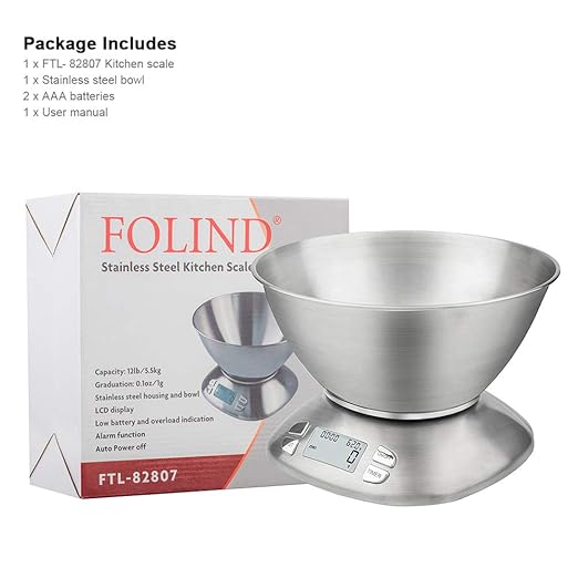 • 【PRACTICAL DESIGN】The food scale is made of stainless steel, which is durable. The included detachable bowl (2. 5L) for easy mixing and pouring, you can also use your own bowl or plate instead. Perfect for baking, cooking, weighting small package etc.