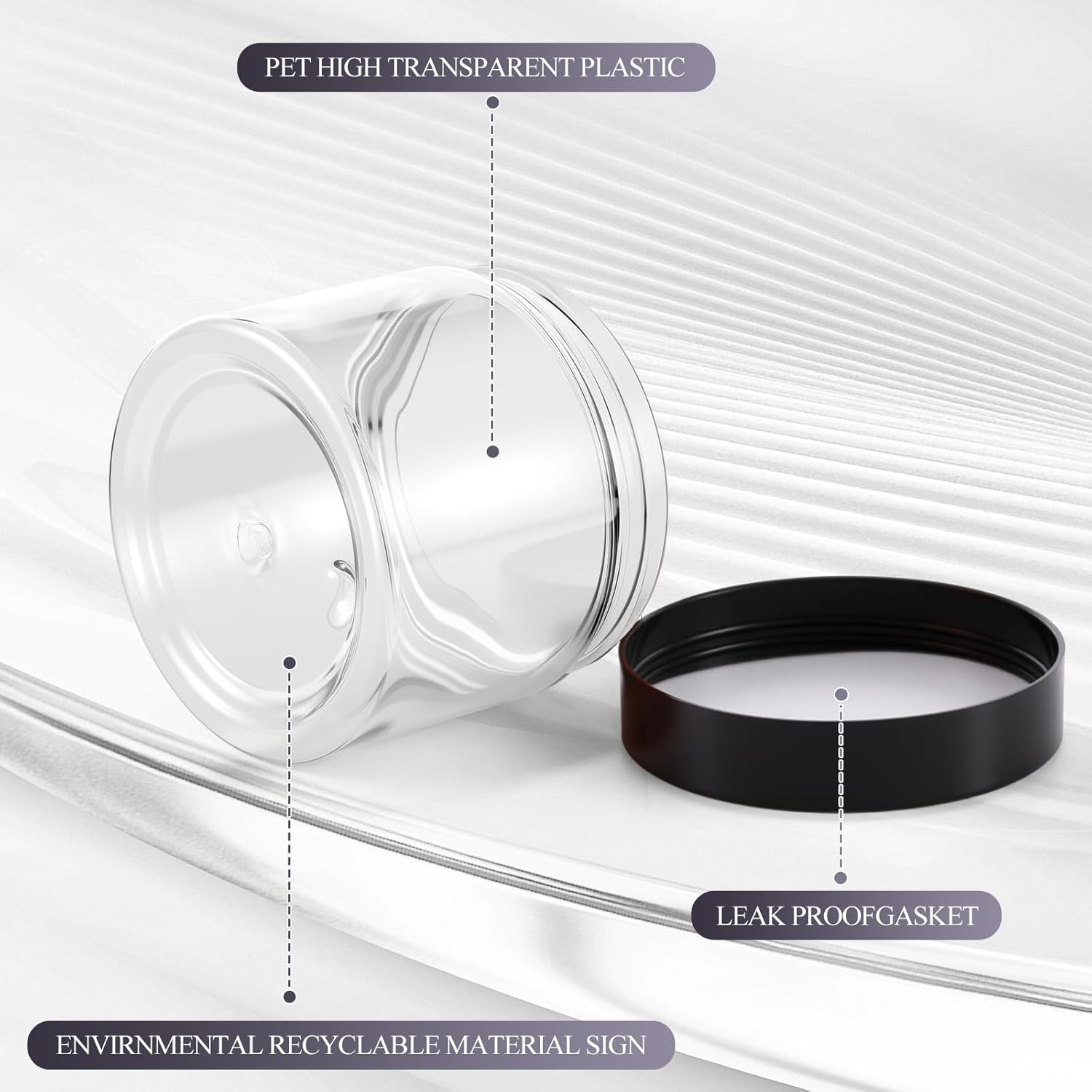 • Quality material: the 1.5 oz plastic jars with lids are made of quality clear plastic, without odd smell, does not contaminate your skincare products, stable, high temperature resistance, a black plastic cover with lid, sealed storage and leak proof
