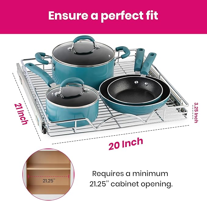 • EASY TO INSTALL & HARDWARE INCLUDED: Our cabinet organizer dimensions measure 20”W x 21”D x 3.15” and includes step by step instructions along with all of the hardware necessary for easy installation. Installs with just a few simple screws so you will get more into your cabinets now than ever before. Fits cabinet openings 21” and larger