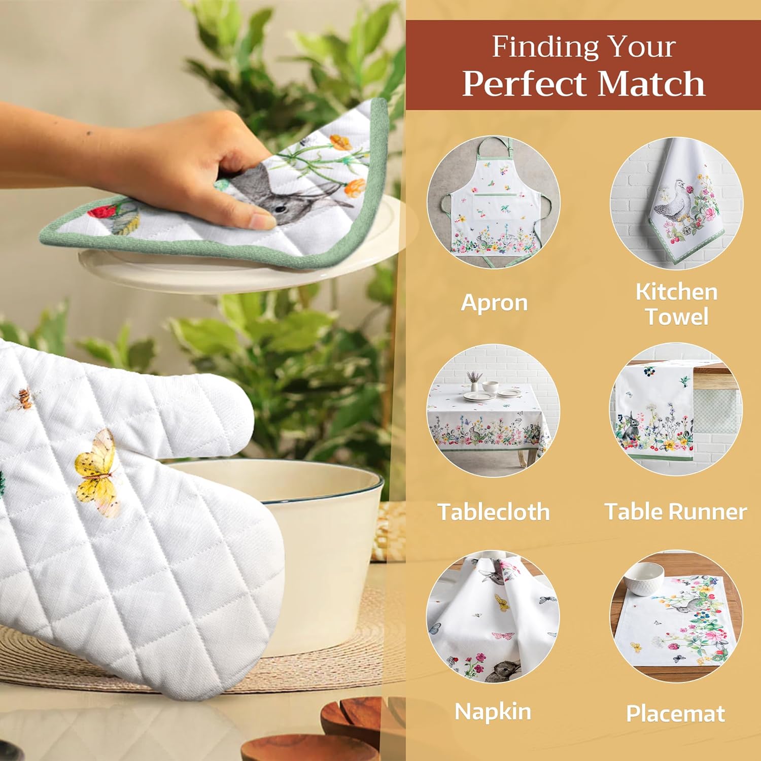 Maison d' Hermine 100% Cotton Oven Mitt & Pot Holder Set (7.5"x13" & 8"x8") Heat Resistant BBQ Cooking Gloves with Loop, Baking, Grilling, Kitchen, Handling Hot Pans Spring/Summer (Printemps)