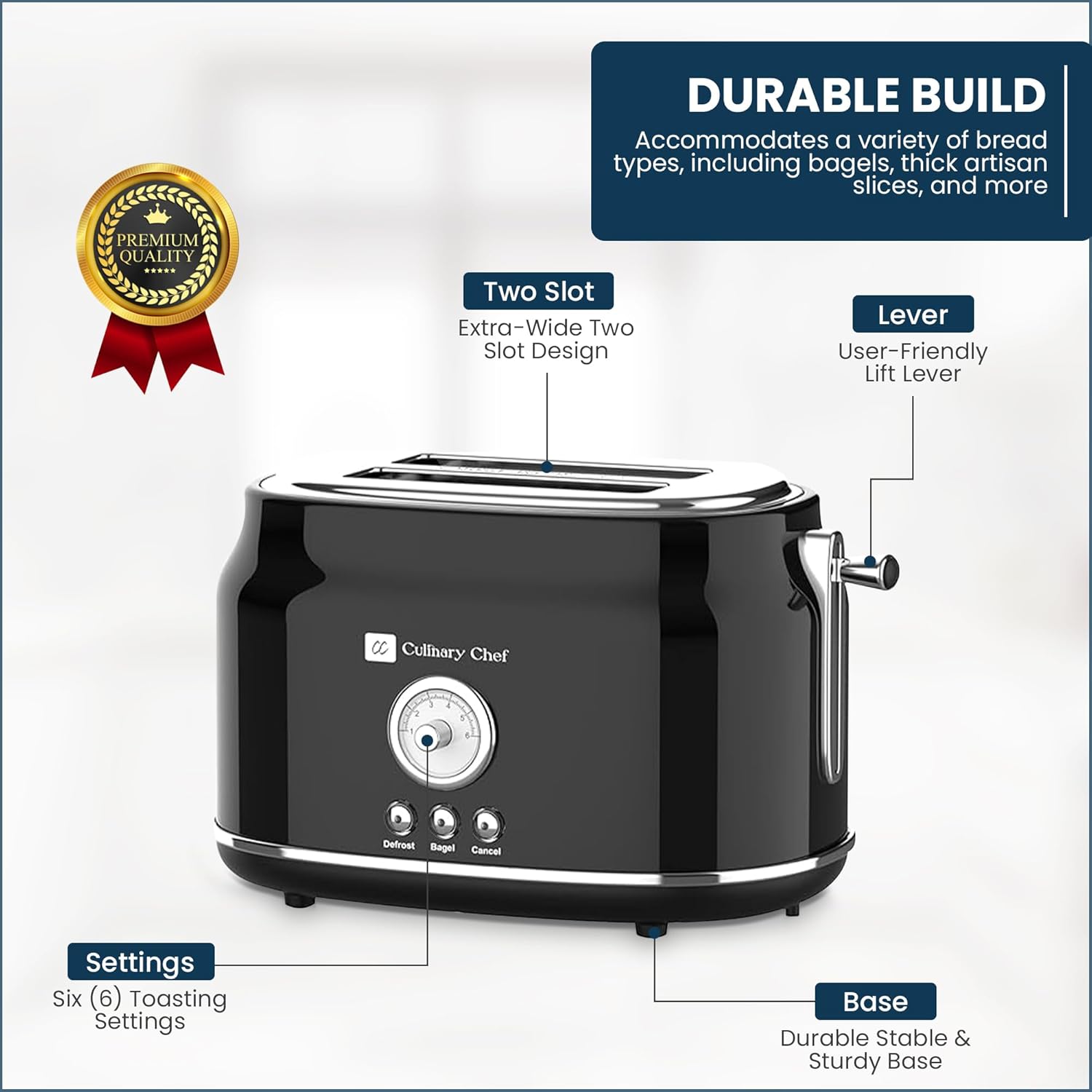 • Multi-Function Support – The Culinary Chef 2 slice toaster wide slot unit has cancel, bagel, and defrost options with 6 browning settings for more personalized toasting.