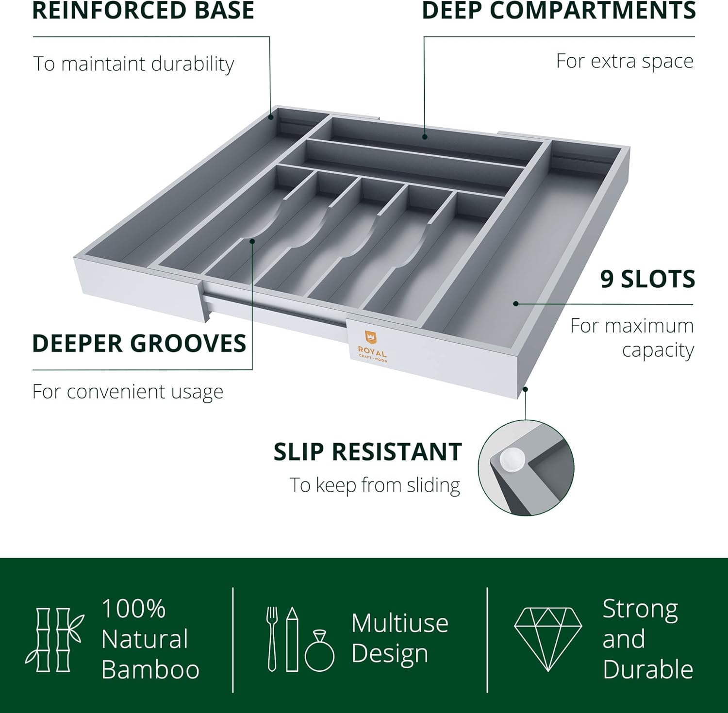 Luxury Bamboo Kitchen Drawer Organizer - Silverware Organizer - Utensil Holder and Cutlery Tray with Grooved Drawer Dividers for Flatware and Kitchen Utensils (9 Slot, Gray)