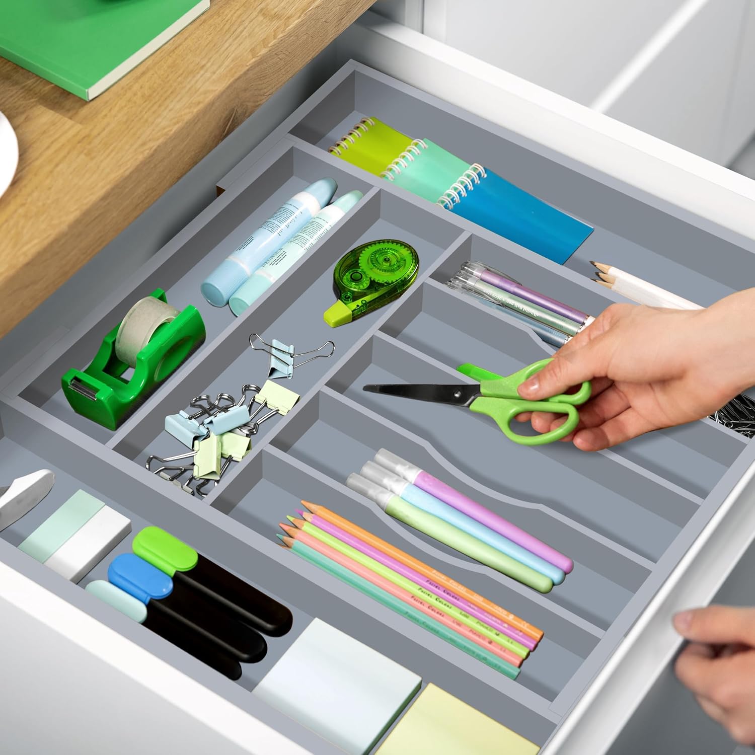 • 🔗𝐌𝐔𝐋𝐓𝐈-𝐏𝐔𝐑𝐏𝐎𝐒𝐄 𝐔𝐒𝐄: Not only is this the perfect solution for keeping your kitchen drawers spic & span, but this organizational tool is extremely versatile, suitable for placement in your office, dresser, makeup drawer, & crafting corner. Easily keep office supplies such as pencils, pens, markers, post-its, paper clips & more together in one place, and easy to grab. Neatly arrange jewelry, make-up brushes, or even paints, paintbrushes, and other art supplies, an all in one organizing solution