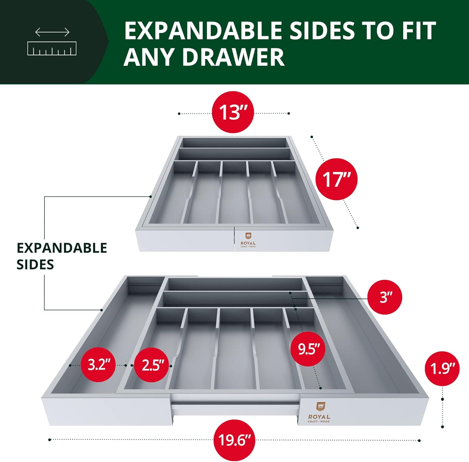 • 🌿𝐄𝐗𝐏𝐀𝐍𝐃𝐀𝐁𝐋𝐄 𝐓𝐎 𝐅𝐈𝐓 𝐌𝐎𝐒𝐓 𝐒𝐓𝐀𝐍𝐃𝐀𝐑𝐃 𝐊𝐈𝐓𝐂𝐇𝐄𝐍 𝐃𝐑𝐀𝐖𝐄𝐑𝐒: Our deep bamboo drawer organizer is ideal for saving kitchen storage space, thanks to its adjustable storage drawers that expand from 17”x13” to 17x19.6” wide with 1.9” deep slots. Easy to use and ideal for helping to maximize kitchen storage space, simply pull apart from the sides for additional storage space and a more secure fit for wider drawers. Different sized compartments allow for standard silverware and large utensil placement