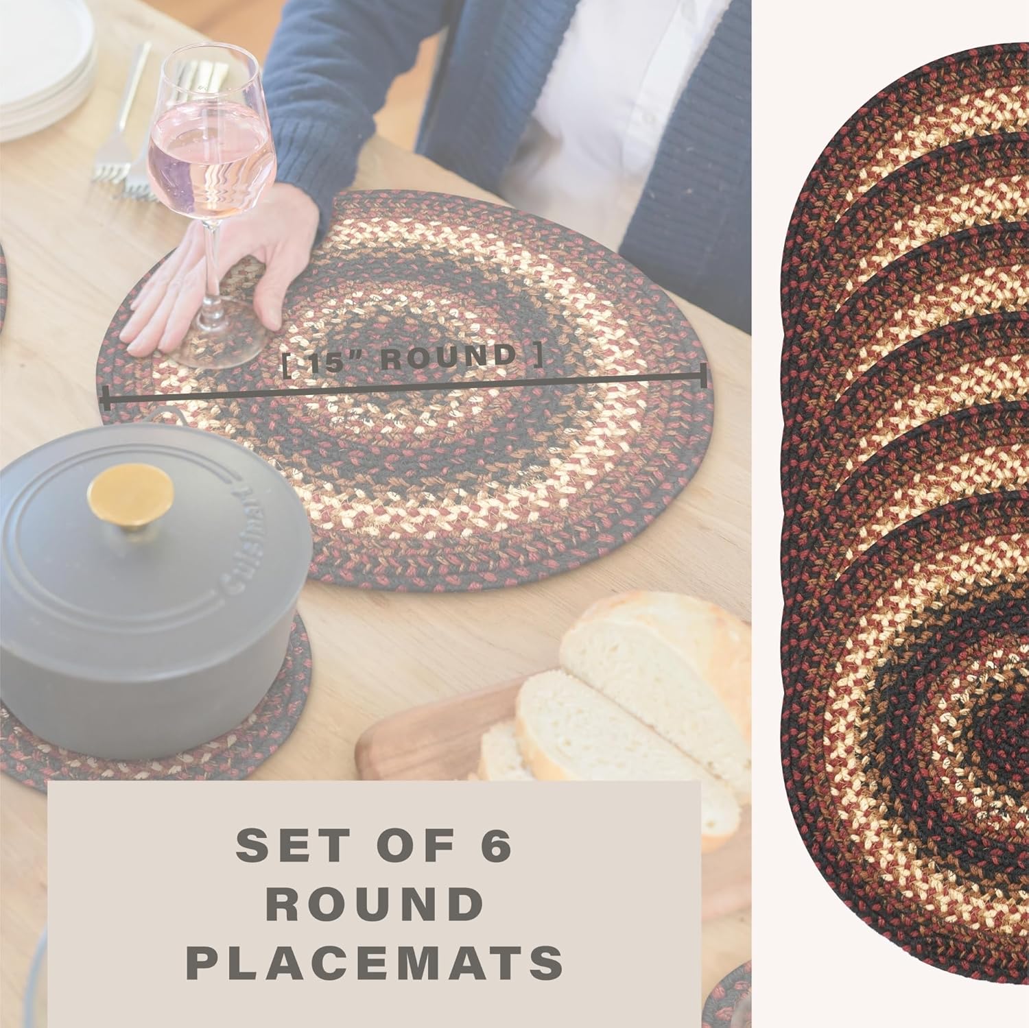 Prescott Jute Woven Round Placemats Set of 6, 15", Country Primitive Decor, Black and Red Table Mats - Vibrant Colors, Durable, Easy to Clean and Protects Furniture