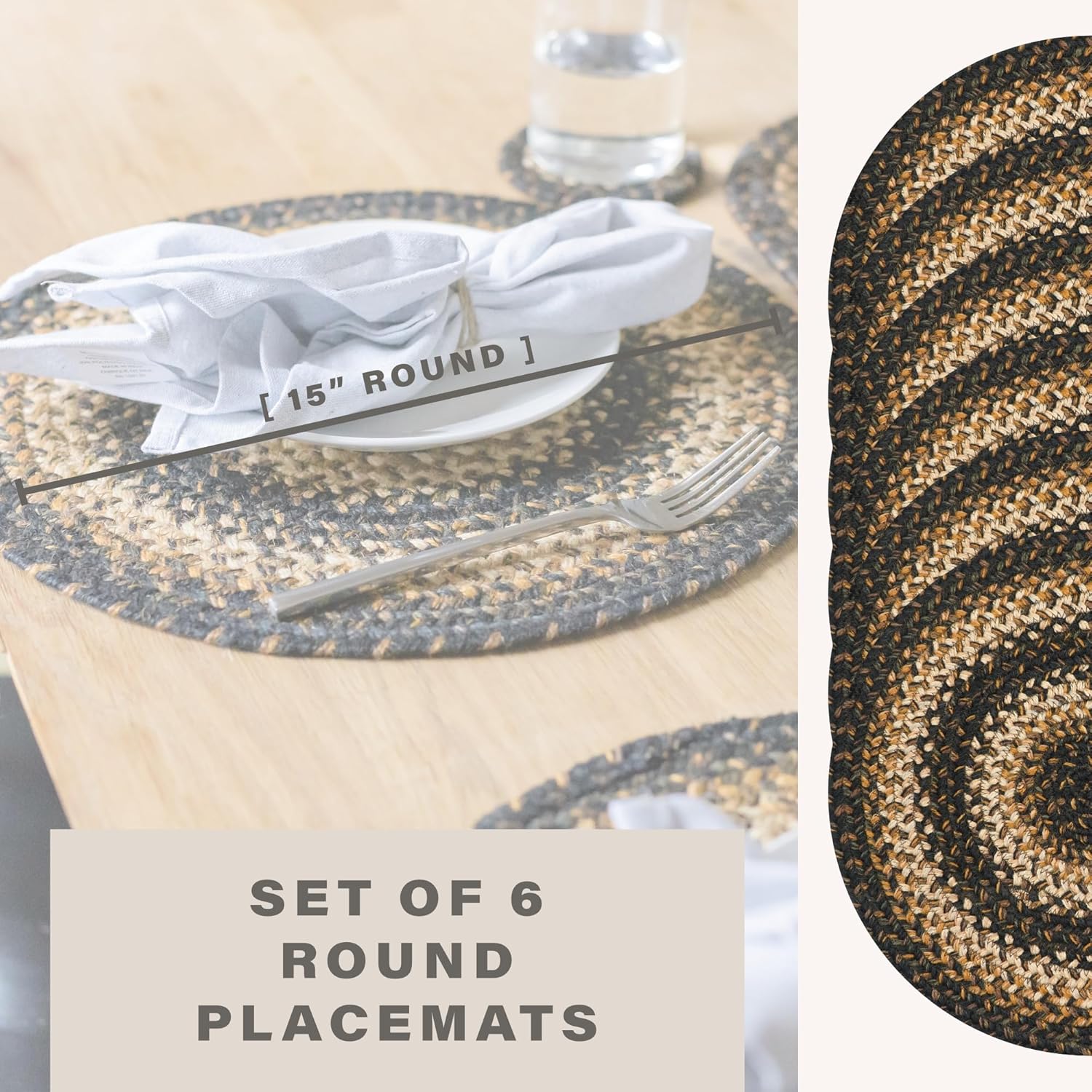 Kilimanjaro Jute Woven Round Placemats Set of 6, 15", Warm Primitive Decor, Black and Tan Table Mats - Vibrant Colors, Durable, Easy to Clean and Protects Furniture