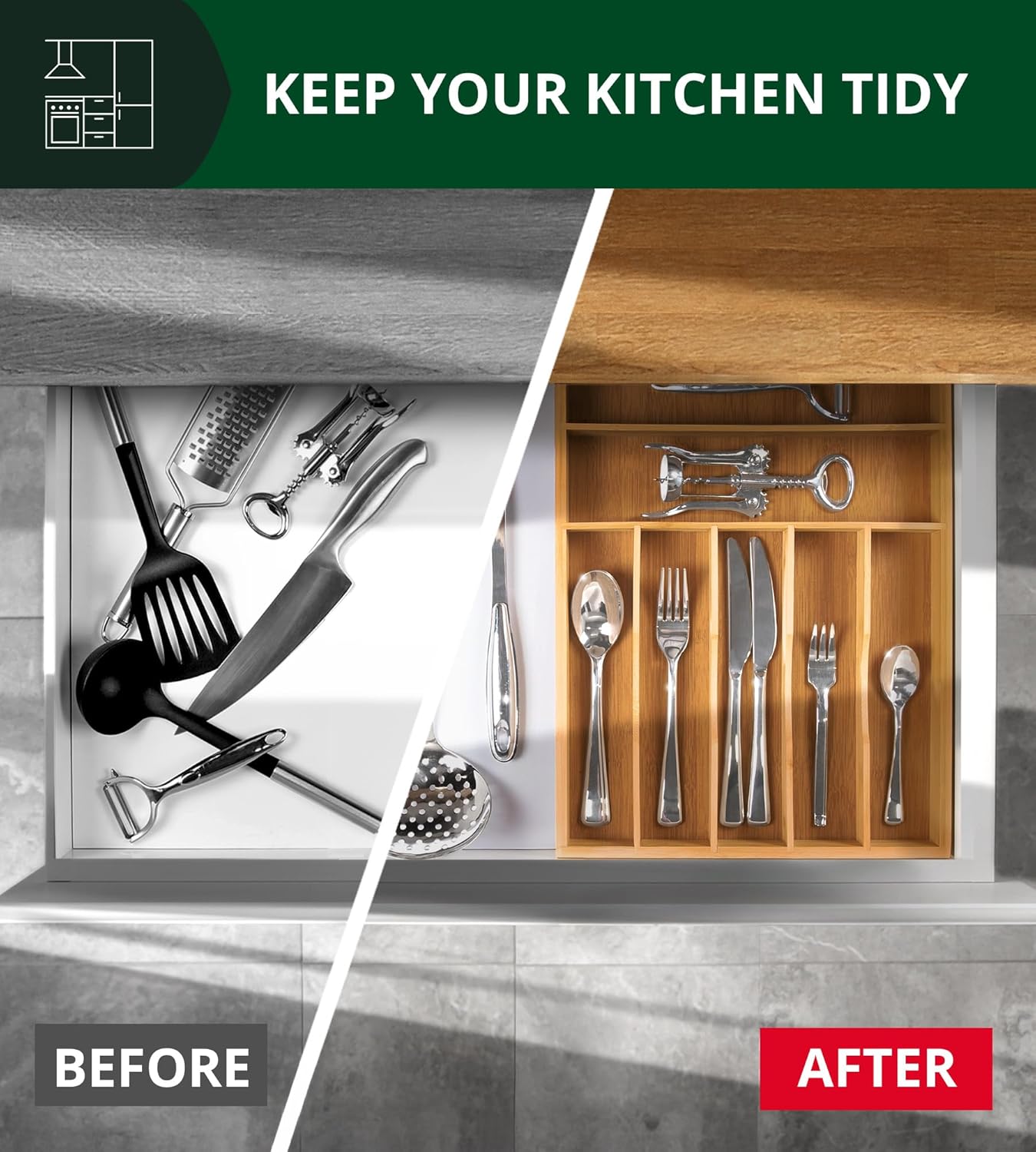 • 𝐌𝐀𝐃𝐄 𝐅𝐑𝐎𝐌 𝐍𝐀𝐓𝐔𝐑𝐀𝐋 𝐁𝐀𝐌𝐁𝐎𝐎 𝐖𝐎𝐎𝐃: Our environmentally conscious flatware organizer with drawer inserts are made from minimally refined wood, a renewable, sustainable source, making them a green choice. The smooth, water resistant wood grain design helps the kitchen utensil crock fit in with existing kitchen decor. Water & odor resistant, the silverware organizing tray is perfect for years of use, especially in kitchens where things can get messy quickly