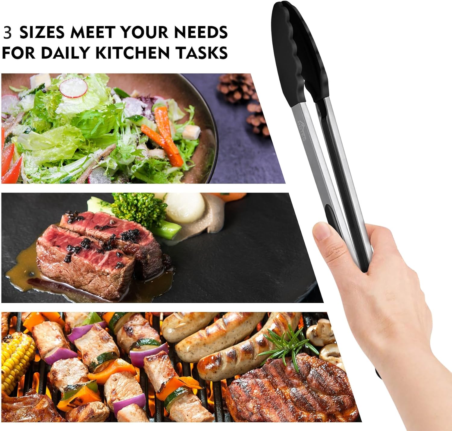 HOTEC Premium Stainless Steel Locking Kitchen Tongs with Silicon Tips, Heat Resistant Cooking Tongs Set of 3-7", 9" and 12" (Black)