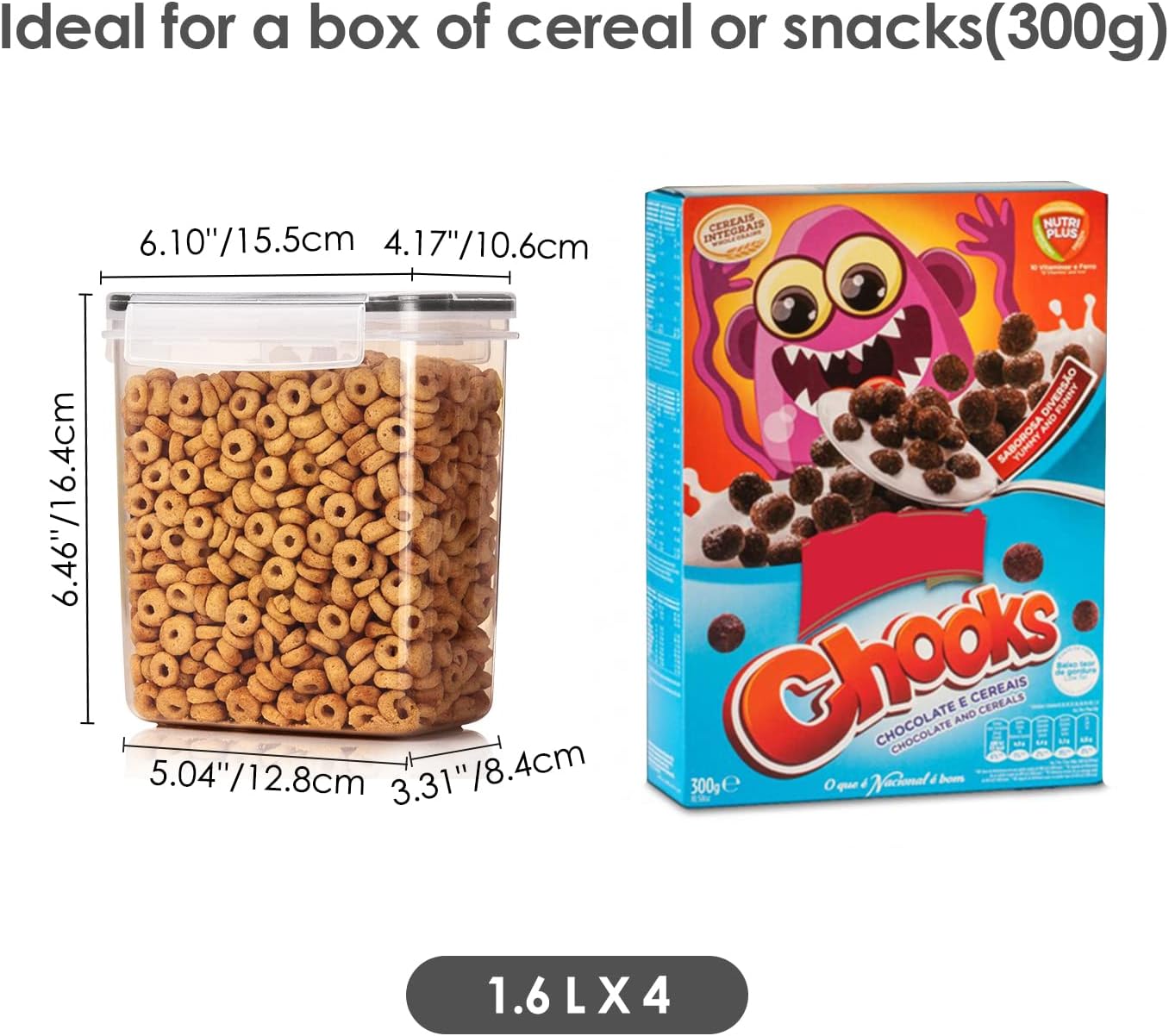 • Perfect for Different Storage----Our kitchen storage containers set comes in two different sizes. 2 large containers are 3.3 quart (3.6 liters), which is the ideal size for a 5 lb bag of flour and sugar. Other 4 small containers are 1.5 quart (1.6 liters ), they are perfect for storing a small box of cereal (300g). You also can use them to store baking supplies,oats, pasta, rice, coffee, tea, snacks, nuts.