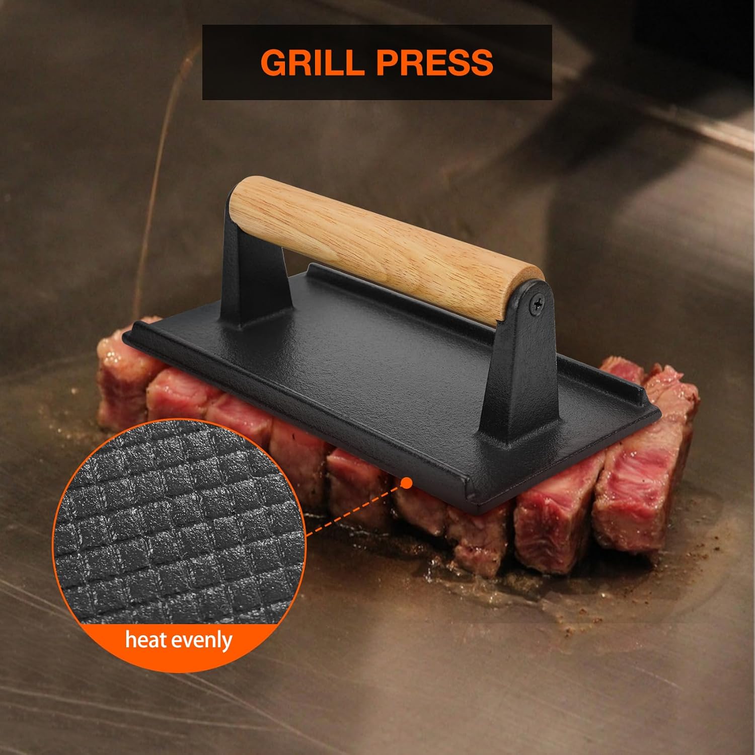 • ☛STURDY AND DURABLE: Three Spatulas and A Chopper are made of high-quality food-grade stainless steel, which is waterproof and rust-proof. This Rectangular Meat Press is Made of high-quality food-grade cast iron, which is healthy, corrosion-resistant, has a long life and ensures food safety.