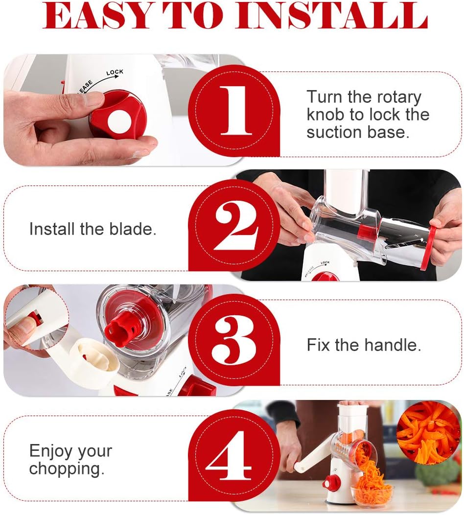 • Three blades for various kitchen needs: slicing, coarse shredding and fine shredding. The rotary grater is ideal for grating cheese, potato, carrot, cucumber, radish, nuts, chocolate, broccoli, etc. for pizza tops, cauliflower rice, hash brown and so on