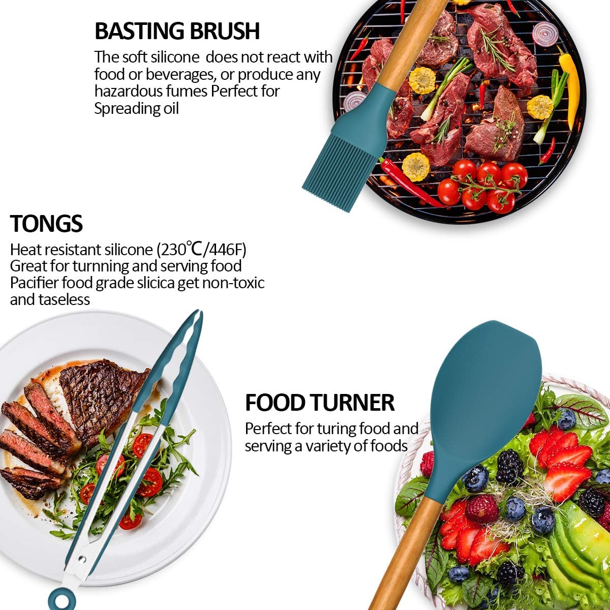 • 33 DURABLE WOODEN HANDEL KITCHEN UTENSILS SET: Anti scalding protect your hand from burning, 33 professional silicon Kitchen utensil set includeshe set includes flexible spatula, soup ladle,serving spoons pasta server, spatula turner , tongs, mesuring cup and spoons, 10 hooks, silicone mat and so on. Meet your all kinds of kitchen needs, Because of the wooden handle, We don't recommend soaking in water for a long time or dishwasher cleaning