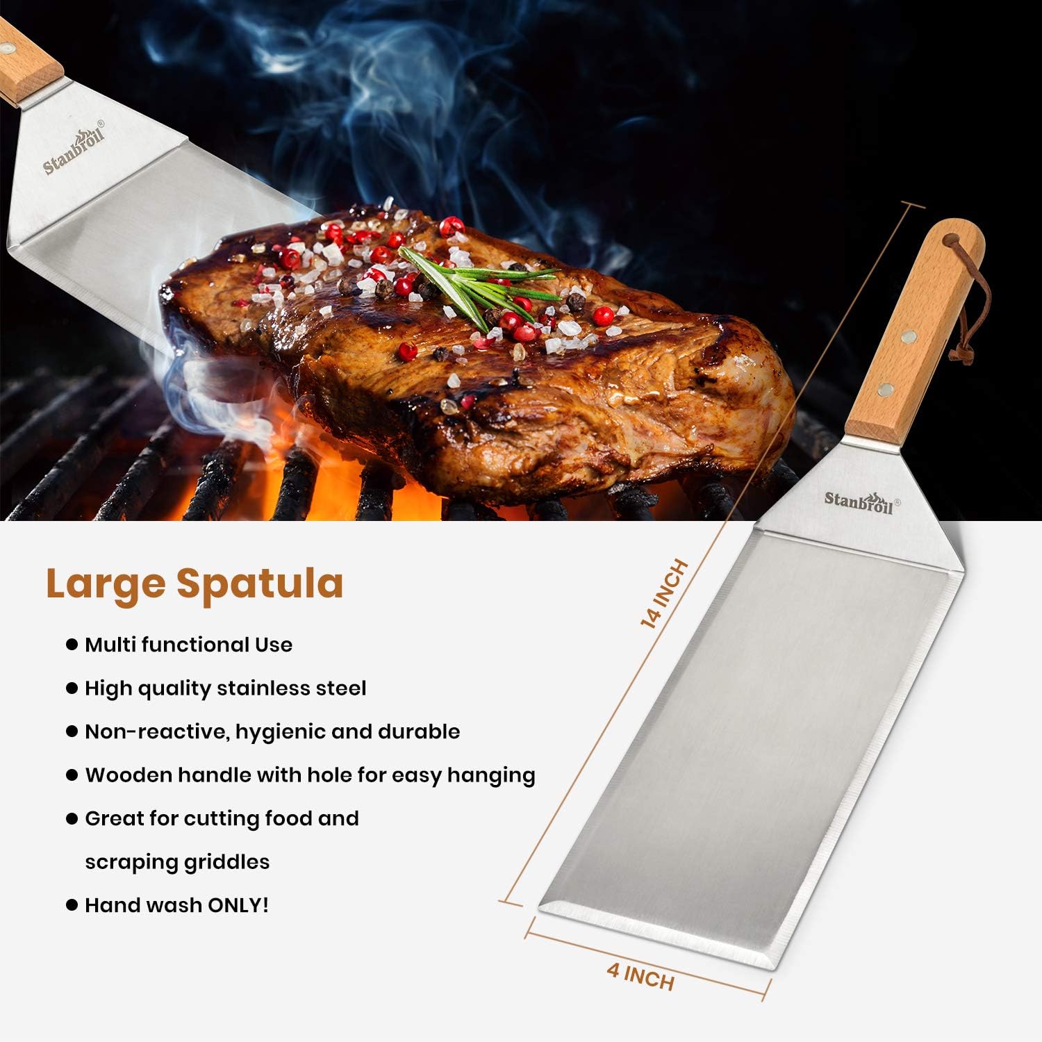 • PACKAGE INCLUDE: 1 x large spatula, 1 x griddle spatula, 1 x griddle turner/scraper, 1 x Grill Press. Heavy duty and sturdy construction make them last longer to use.