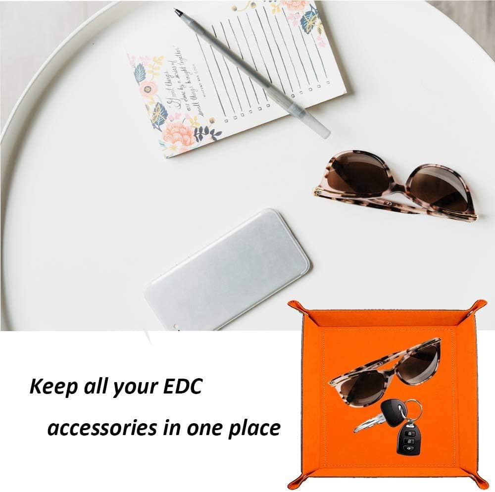 • This valet tray organizer is made from high quality PU leather material, a favorable choice in terms of water-proof, scratch-proof, durable enough for a long lasting. Valet storage tray dimension: Snapped size: 7.4"L x 7.4"W x 1.7"H (19 x 19 x 4.5 CM ).