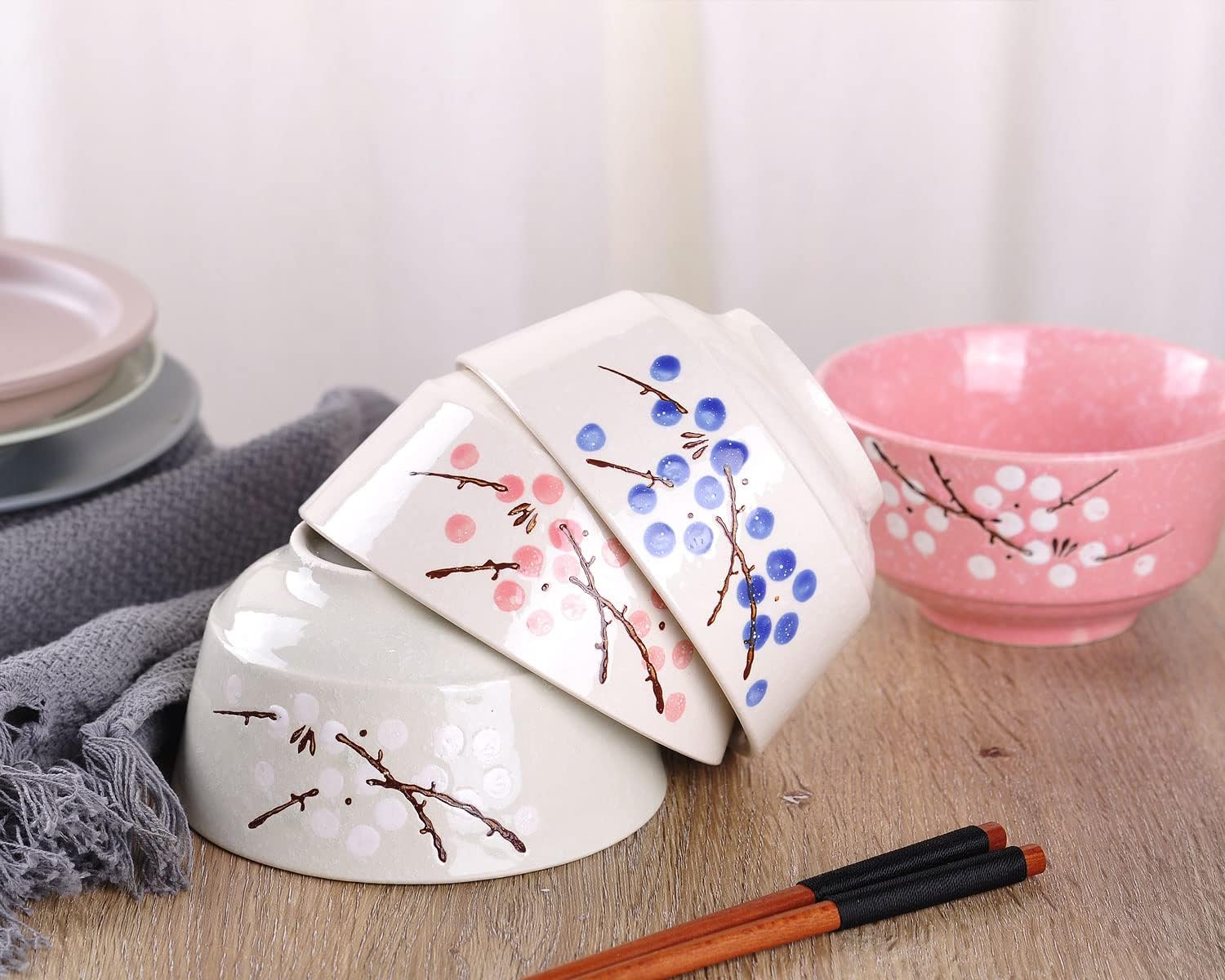 VanEnjoy Set of 4 Japanese Style Ceramic Rice Bowl,4 Assorted Color Cherry Blossoms Among Snow Flake Pattern Bowls Set